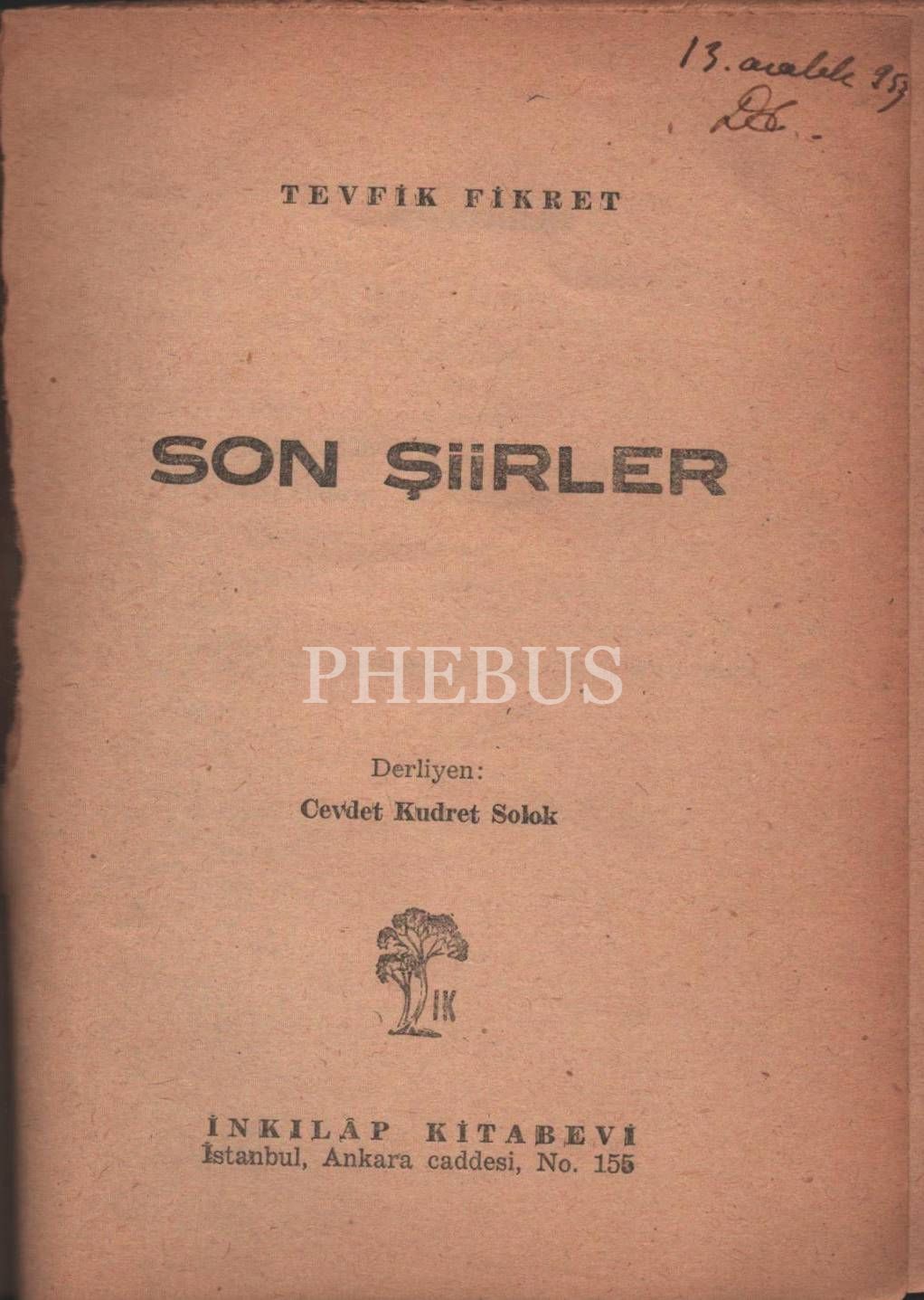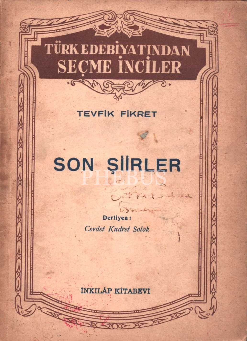 SON ŞİİRLER, Tevfik Fikret, derliyen: Cevdet Kudret Solok, İnkılâp Kitabevi, 47 sayfa, 13x18 cm