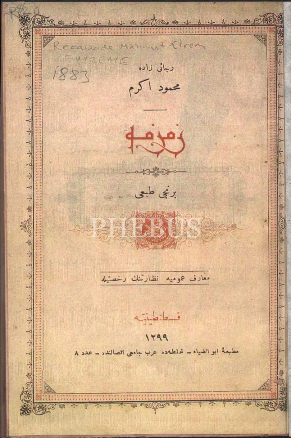 ZEMZEME, Recaizâde Mahmud Ekrem, Matbaa-i Ebuzziya, İstanbul 1299, 83 sayfa, 13x19 cm