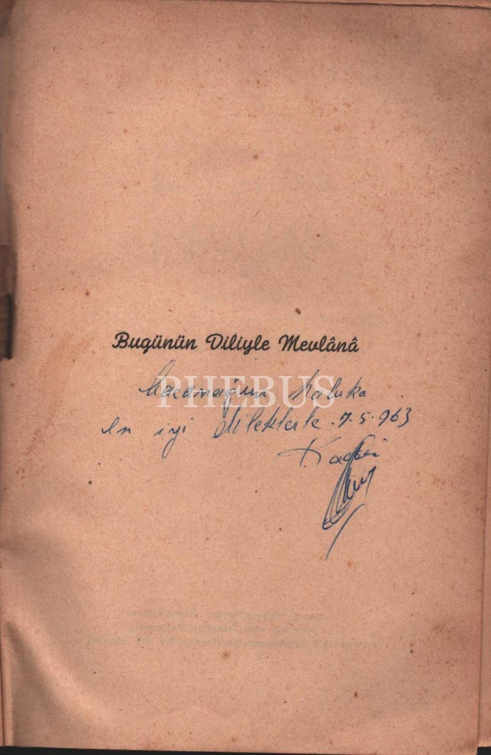 Yenileştiren A. Kadir´den ithaflı ve imzalı Bugünün Diliyle MEVLÂNÂ, İstanbul Matbaası, 1958, 95 sayfa, 14x20 cm