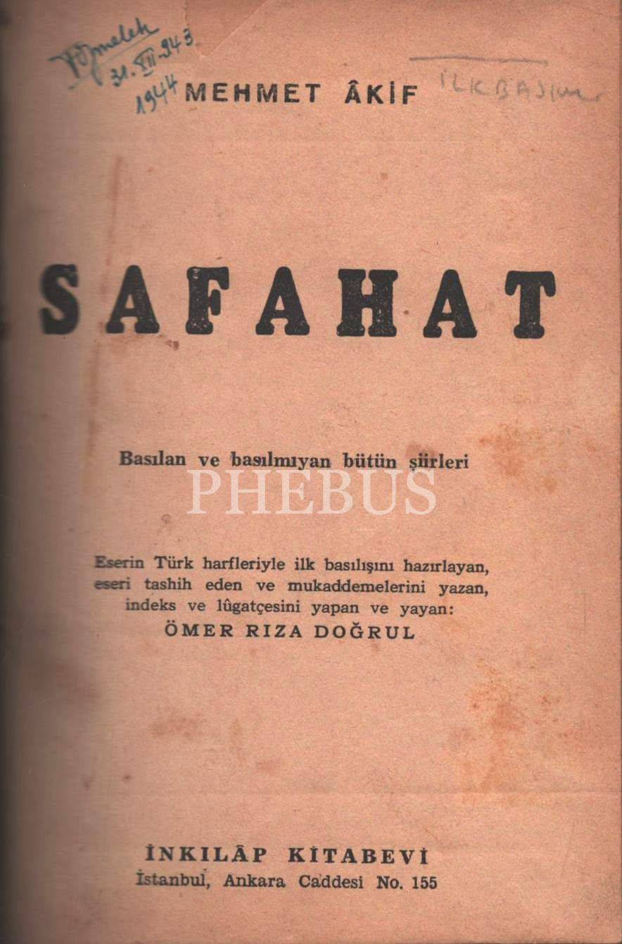 SAFAHAT (Basılan ve Basılmayan Bütün Şiirleri), Mehmet Âkif, hazırlayan: Ömer Rıza Doğrul, İnkılâp Kitabevi, İstanbul - 1943, 534 sayfa, 13x18 cm