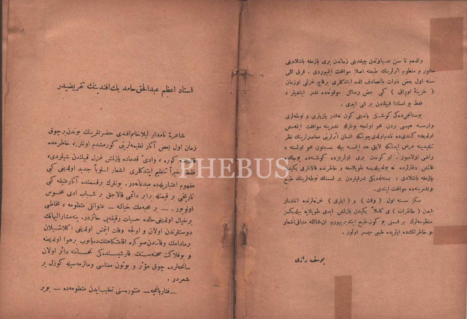 "Üstad-ı A´zam Abdülhak Hâmid Bey"in takrizini içermektedir. Bazı sayfaları yırtık ve tamirlidir.