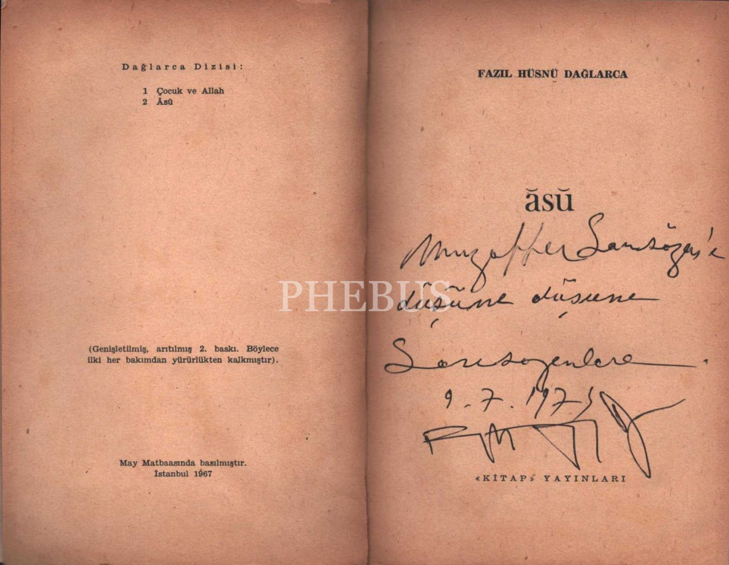 Fazıl Hüsnü Dağlarca´dan Muzaffer Sarısözen´e ithaflı ve imzalı ÂSÛ, Kitap Yayınları, İstanbul - 1967, 318 sayfa, 13x20 cm
