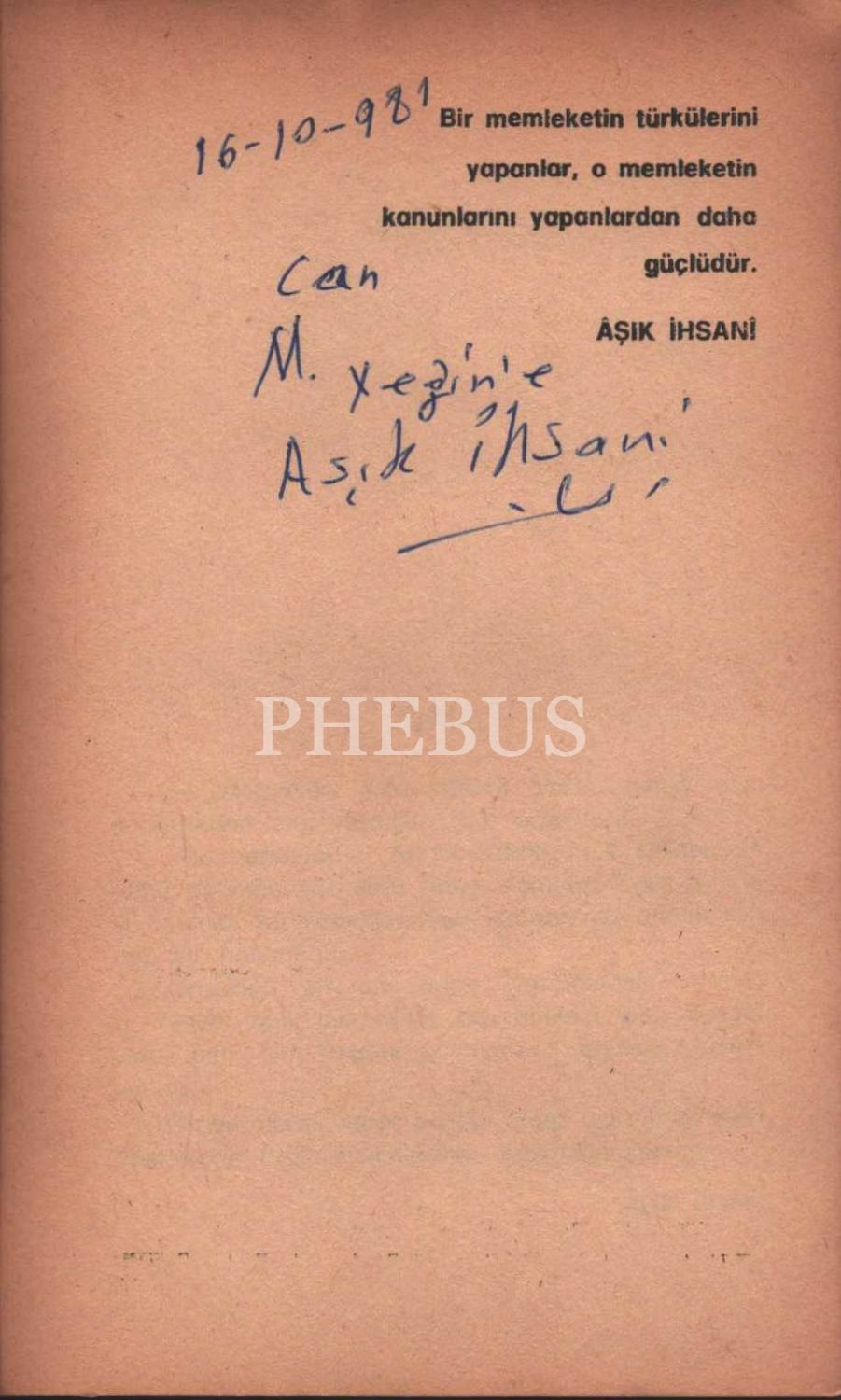 İthaf, "16-10-981 Can M. Yeğin´e Aşık İhsani" şeklindedir.
