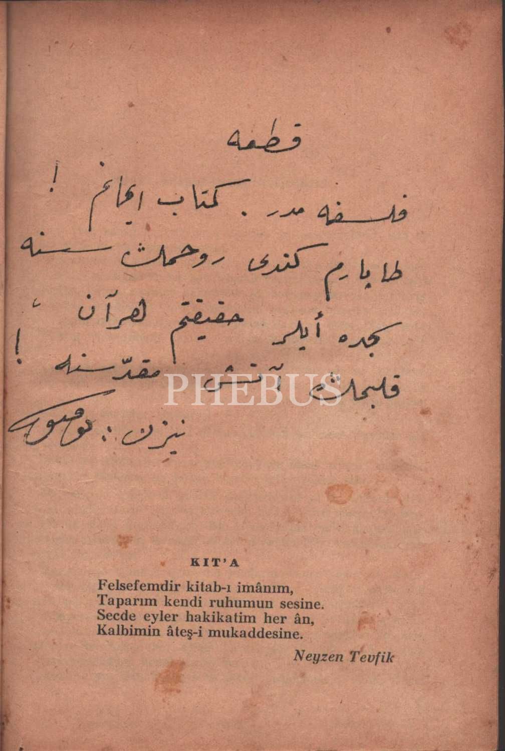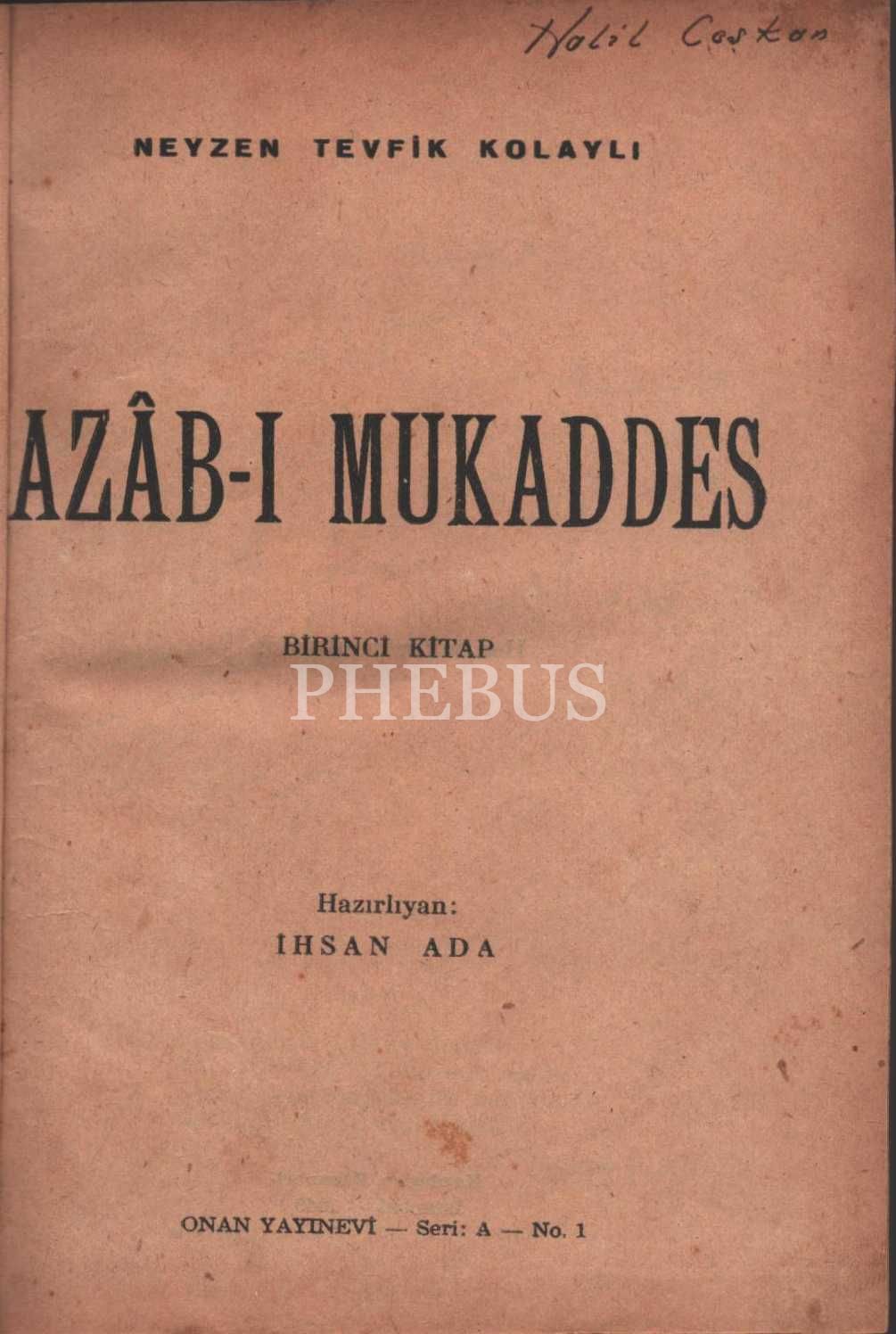 AZÂB-I MUKADDES (Birinci Kitap), Neyzen Tevfik Kolaylı, hazırlıyan: İhsan Ada, Onan Yayınevi, İstanbul - 1949, 304 sayfa, 15x20 cm