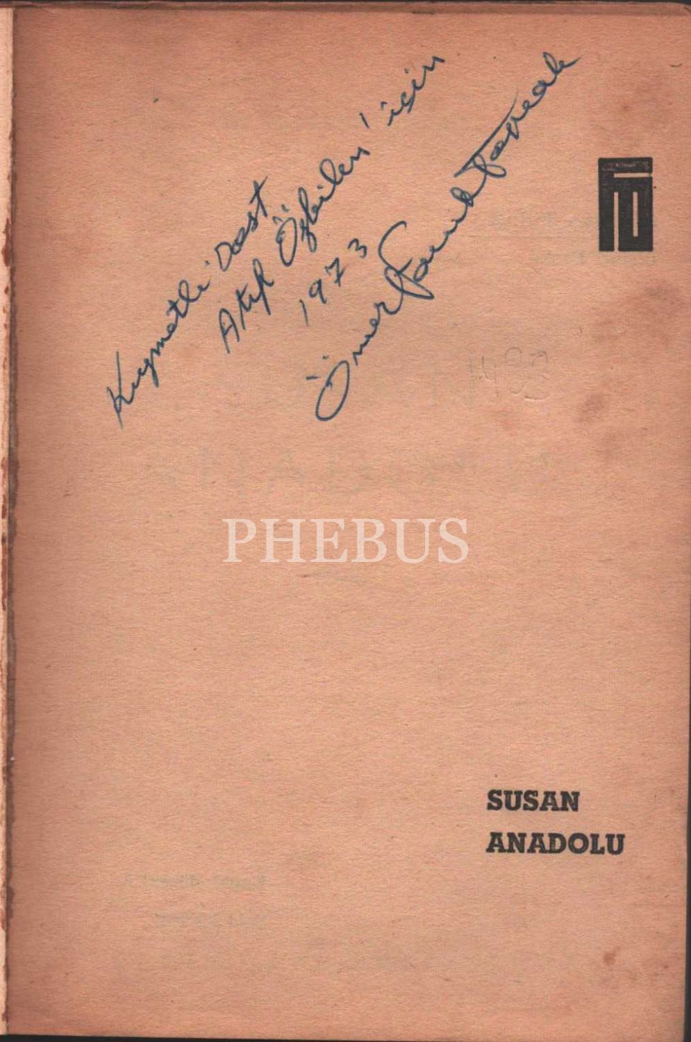 Ömer Faruk Toprak´tan Atıf Özbilen´e ithaflı ve imzalı SUSAN ANADOLU (Şiirler), Fahir Onger Yayınları, İstanbul - 1966, 48 sayfa, 14x20 cm