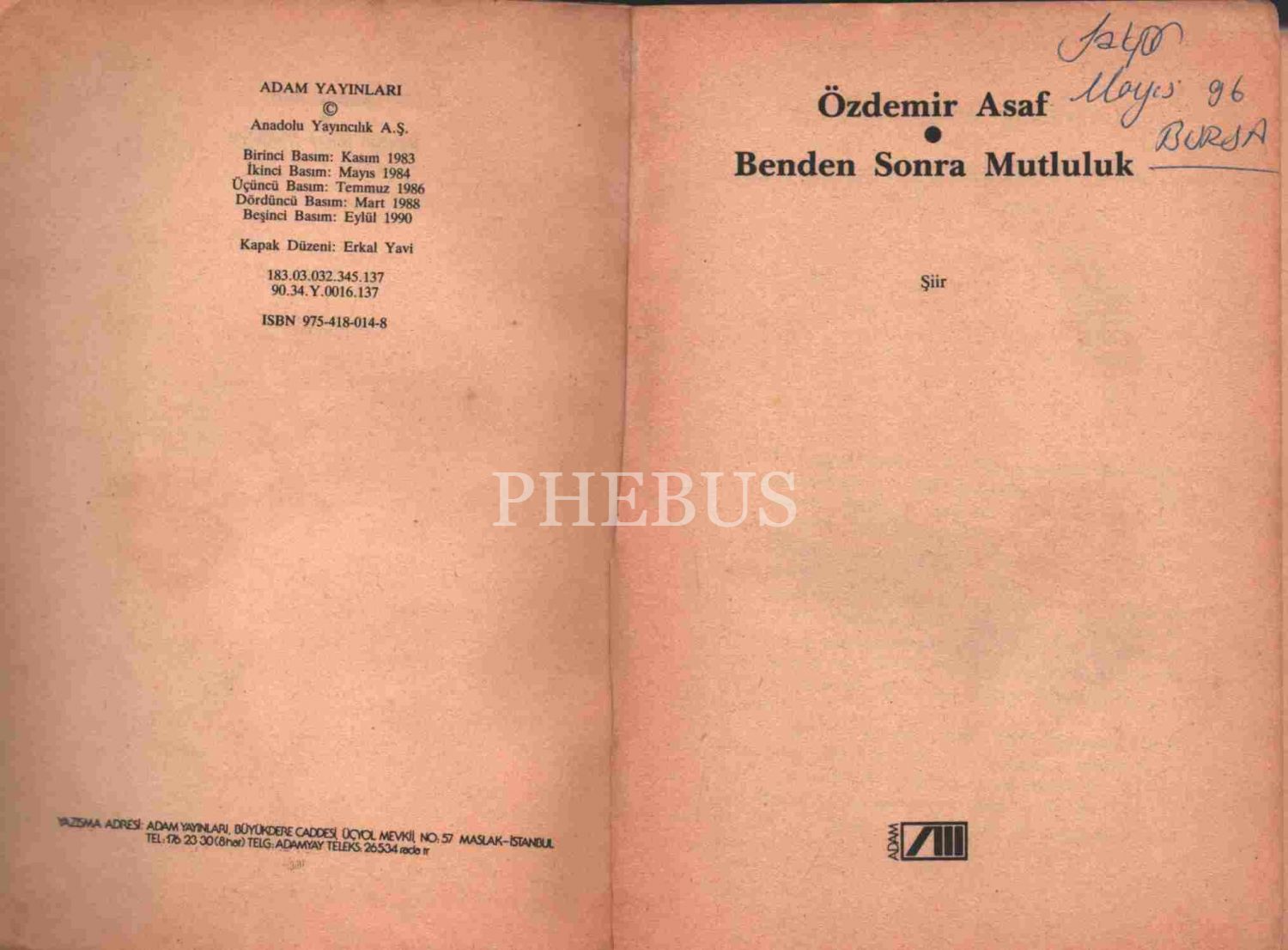 BENDEN SONRA MUTLULUK (Şiir), Özdemir Asaf, Adam Yayınları, Eylül 1990, 286 sayfa, 14x20 cm