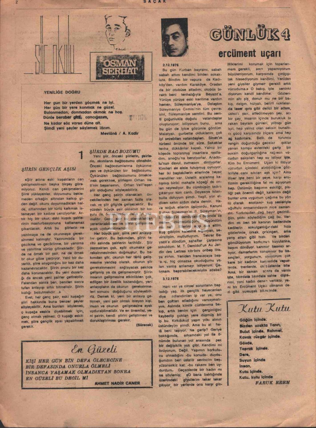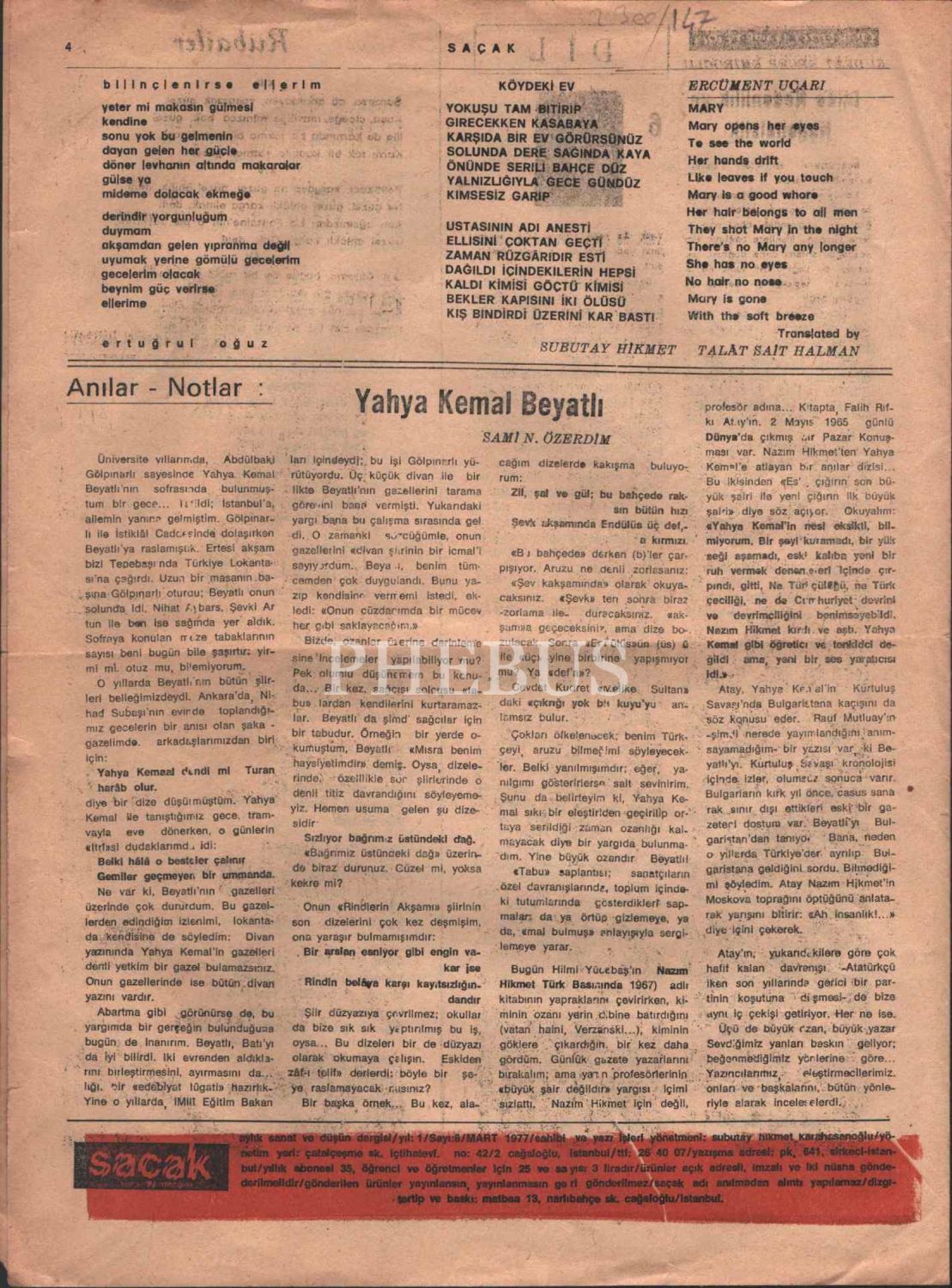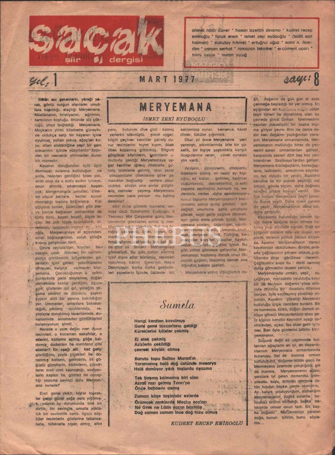 "Şiir Dergisi" SAÇAK´ın Mart 1977 tarihli 8. sayısı, 4 sayfa, 25x34 cm