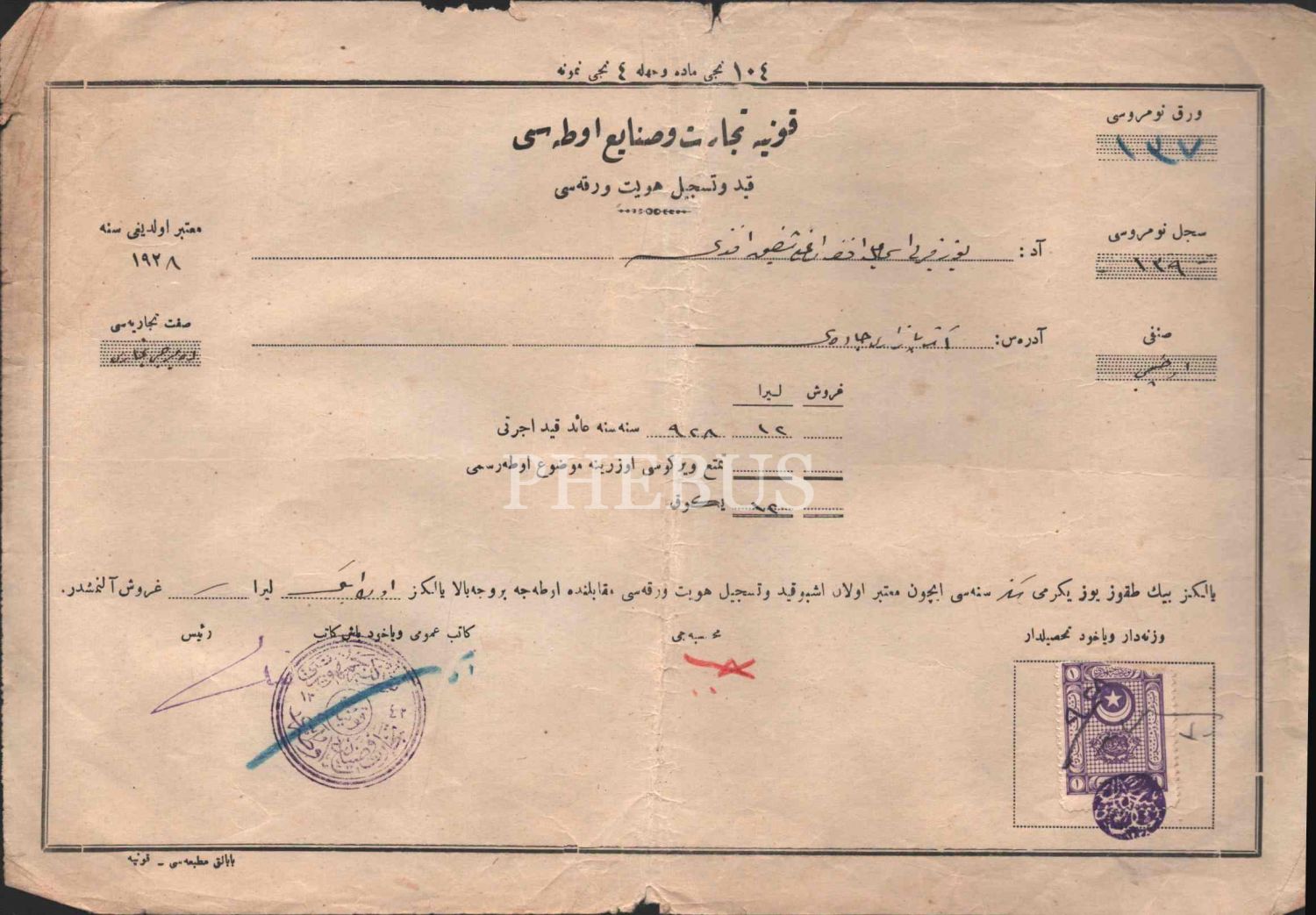 Konya Ticaret ve Sanayi Odası kayıt belgesi, 1928, 20x30 cm