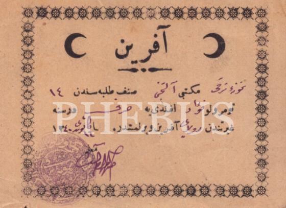 Numune-i Terakki Mektebi´nden sarf dersi için verilen aferin kâğıdı, 1340, 7x10 cm