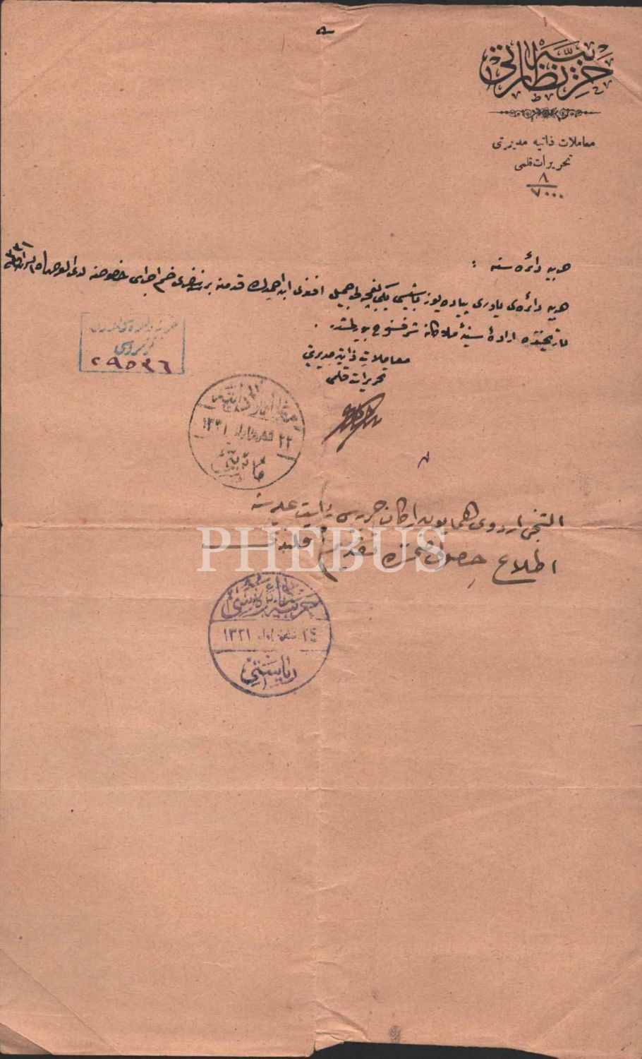 Harbiye Dairesi Yaveri Piyade Yüzbaşısı Yenibahçeli Cemil Efendi´nin kıdemine dair belge, 1331, 16x27 cm