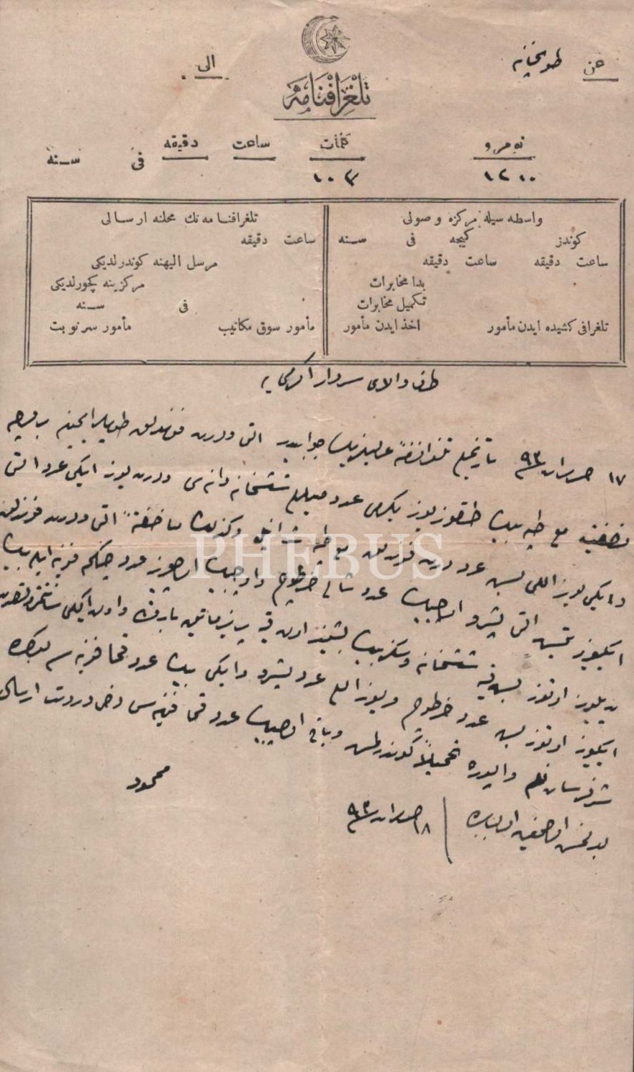 Cephaneden askerî techizat temini hakkında çekilen telgraf, 1293, 15x24 cm
