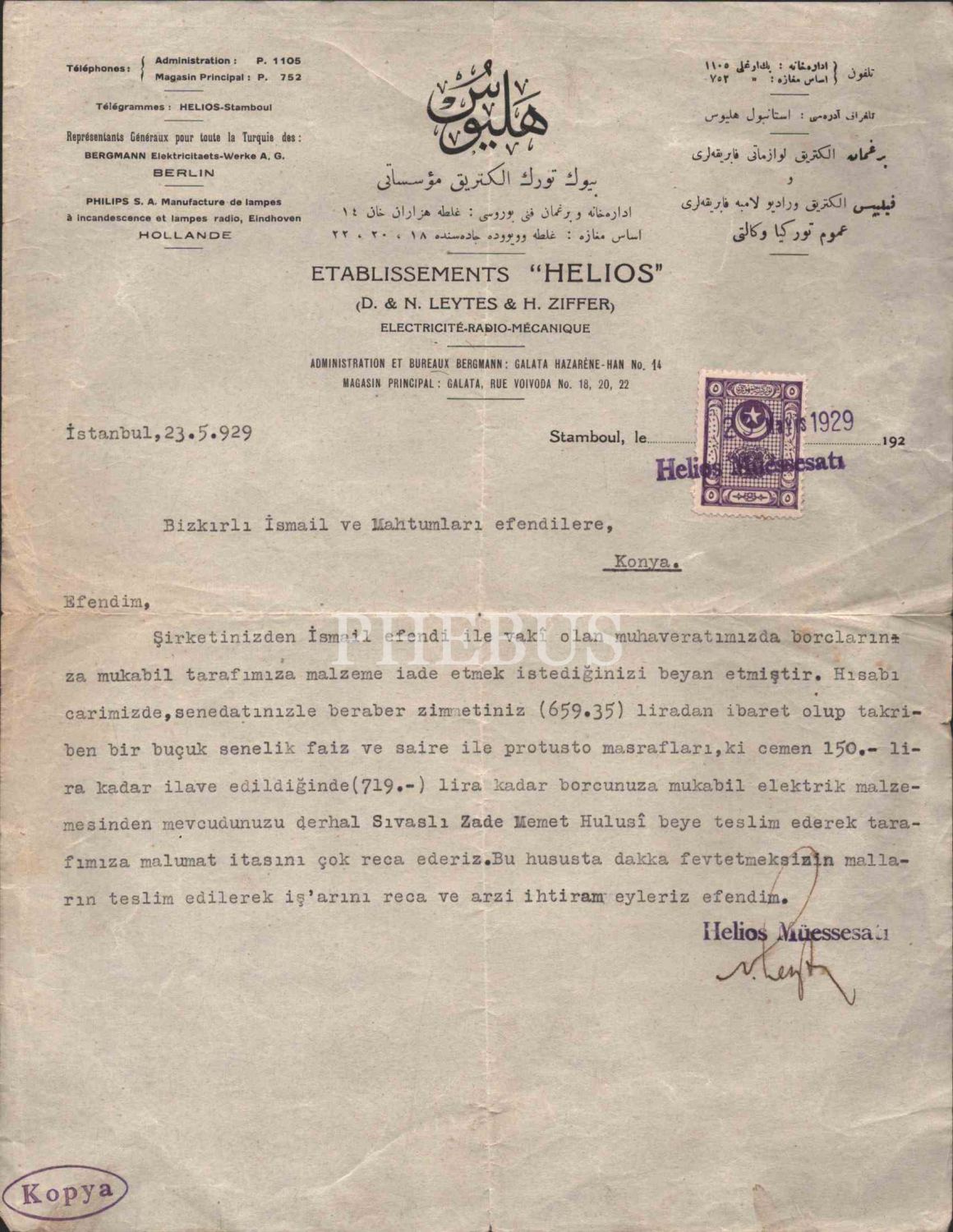 Osmanlıca-Fransızca Helios Büyük Türk Elektrik Müessesatı antetli kâğıt üzerinde kaleme alınan ticari mektup, İstanbul 1929, 22x28 cm