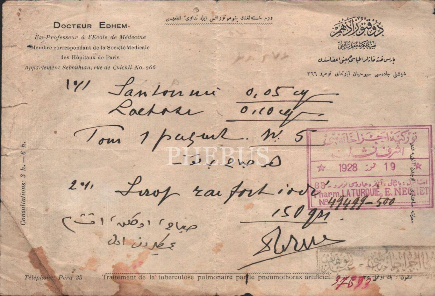 Osmanlıca-Fransızca "Paris Hastahaneleri Etıbbası Cemiyeti Azasından Doktor Edhem" antetli reçete, 1928, 13x20 cm