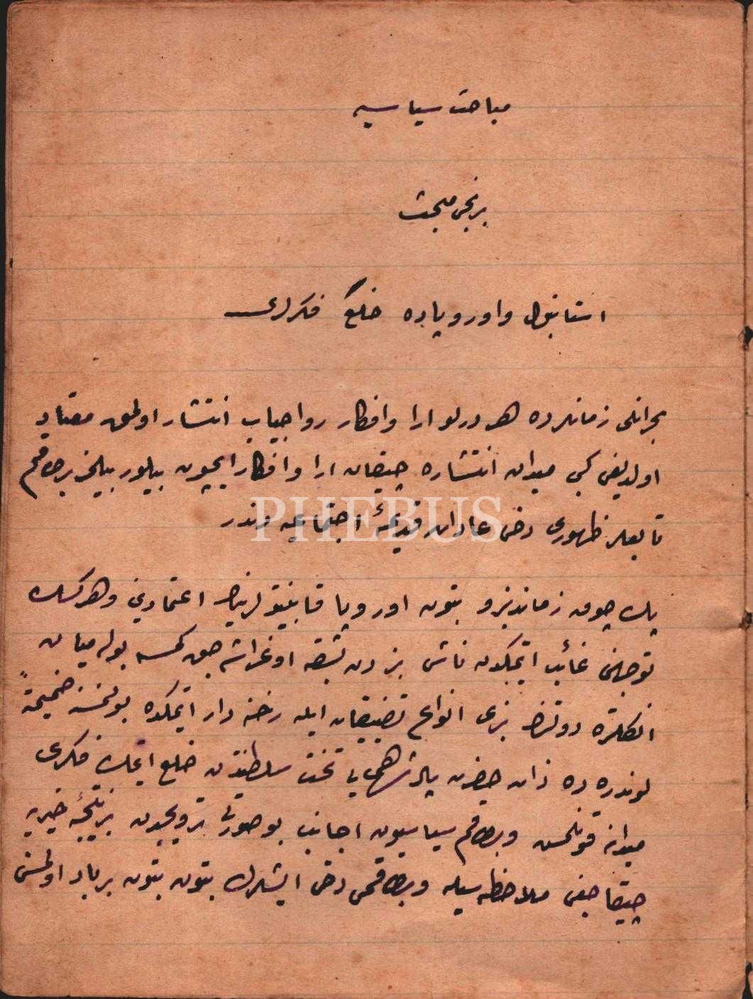 "Mebahis-i Siyasiyye- Birinci Mebhas: İstanbul ve Avrupa´da Hal´ Fikirleri" başlıklı metni içeren defter, 11 sayfa, 13x18 cm