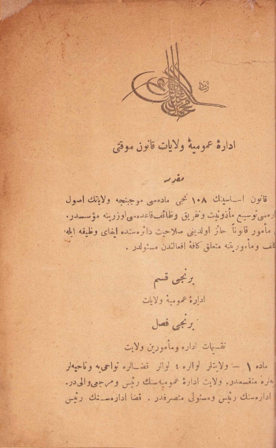 Osmanlıca İdare-i Umumiye-i Vilayet-i Kanun Muvakkiti, birinci kısım - birinci fasıl, 40 sayfa, 14x20 cm.