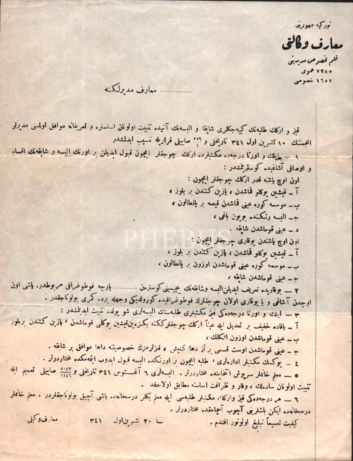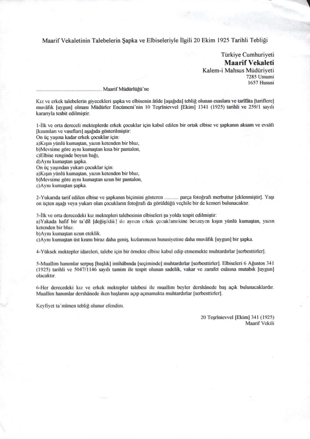 Maarif Vekaleti´nin öğrencilerin şapka ve elbiseleri hakkındaki tebliği, 1341, 20x26 cm