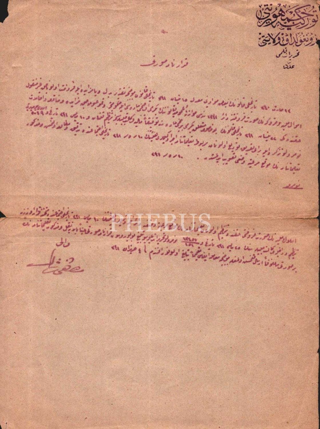 Milli emlakin satışına dair, Zonguldak Vilayeti antetli ve vali imzalı kararname sureti (şapograf baskı), 1341, 16x21 cm