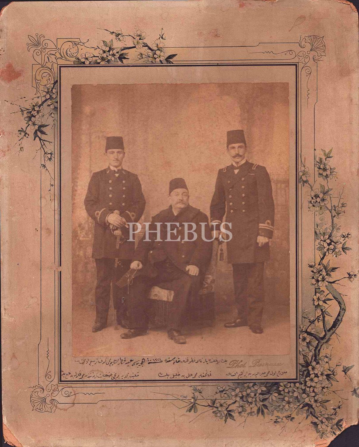 Ramazan Bayramı´nın birinci gününde Beyoğlu Parnasse fotoğrafhanesinde Kaymakam Mehmet Ali Bin Halil Bey, Mekteb-i Bahriye öğrencisi ve Mülazım-ı evvel Mehmet Celalleddin Efendiler´in çekildikleri hatıra fotoğrafı, 1324, 28x34 cm