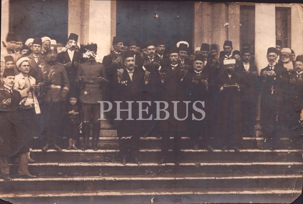 Dualarla açılışı yapılan binanın önünde devlet erkanı, paşalar, hocalar ve öğrencilerin çekildiği toplu hatıra fotoğrafı, 12x17 cm
