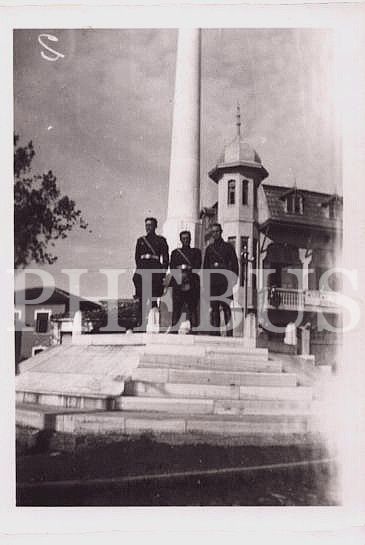 Aydın Şehitler Abidesi önünde hatıra fotoğrafı çekilen üç subay, Aydın 1942, 7x9 cm