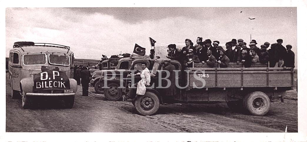 DP ile tarıma dayalı büyümenin ön plana çıktığı bu dönemde kamyonlarıyla poz veren çiftçiler, 9x18 cm