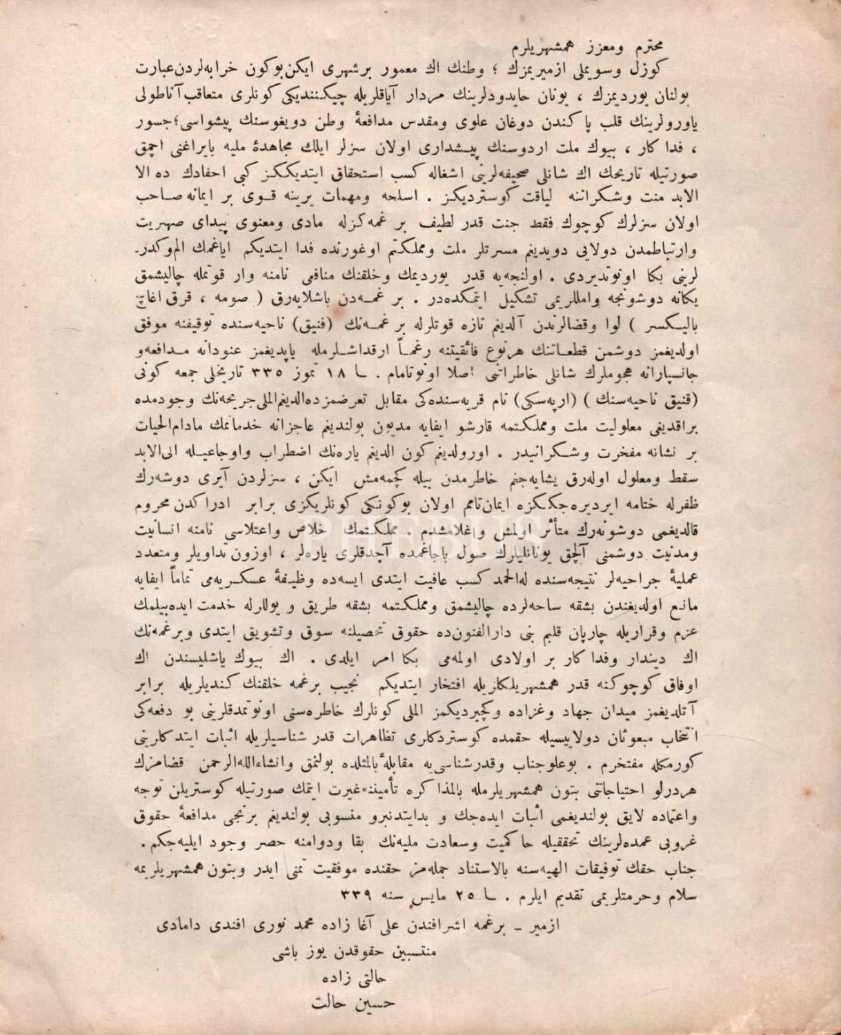 Yüzbaşı Hilmizade Hüseyin Halit´in İzmir´in işgali sonrasında vatandaşlara nutku 25 Mayıs 1339, 17x21 cm