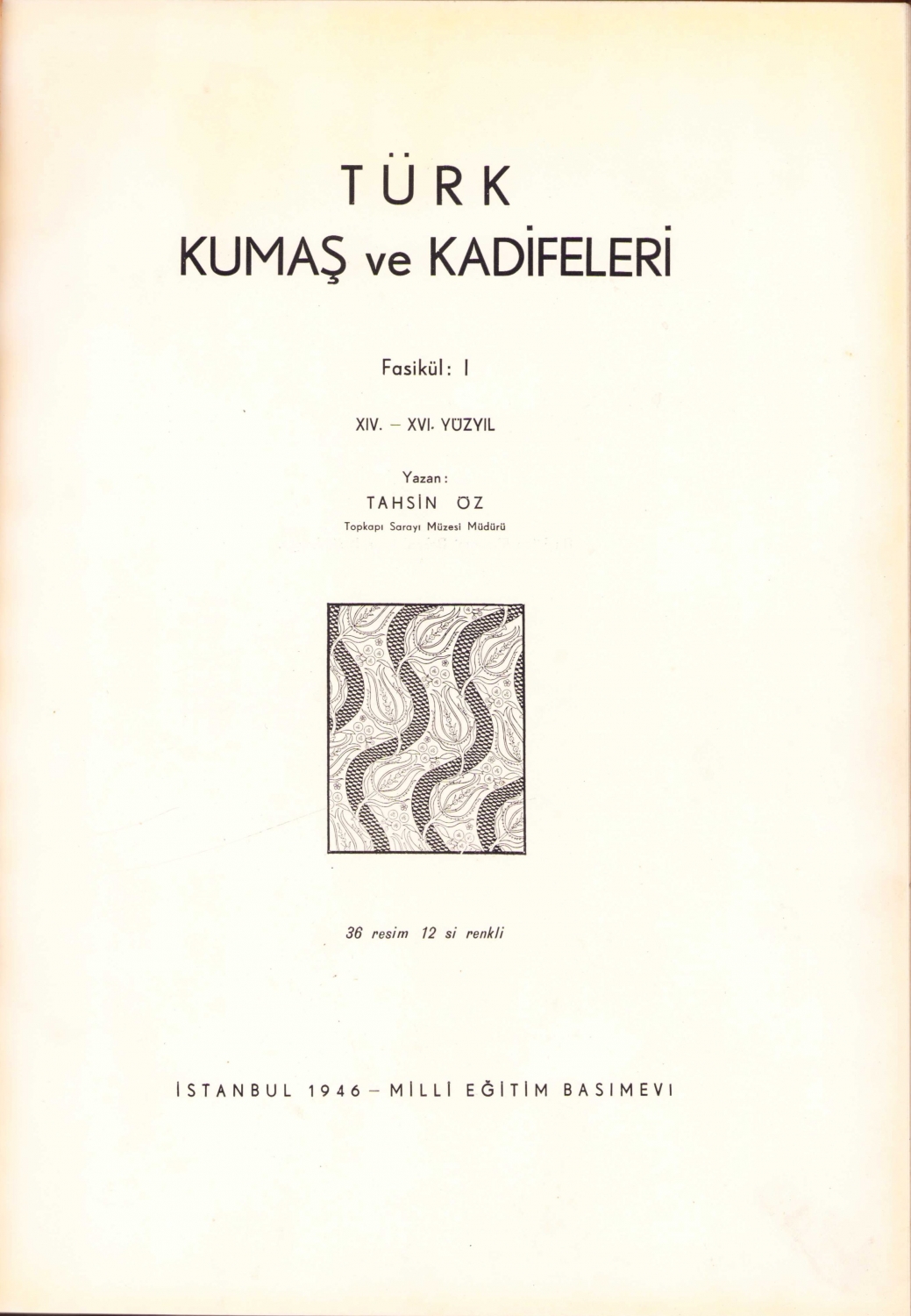 Türk Kumaş ve Kadifeleri -Fasikül: I, Tahsiz Öz, Milli Eğitim Basımevi, İstanbul, 1946, 36 resim 12 si renkli, 125 sayfa, 24x33 cm