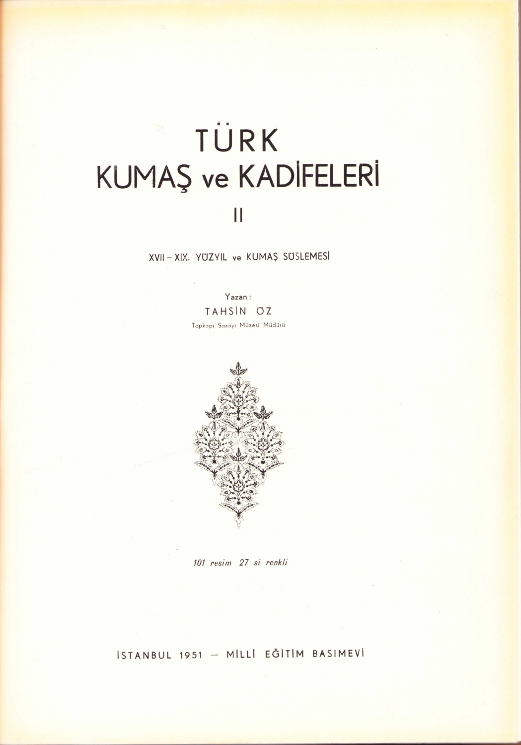 Türk Kumaş ve Kadifeleri II, Tahsiz Öz, Milli Eğitim Basımevi, İstanbul, 1946, 101 resim 27si renkli, 250 sayfa, 24x33 cm