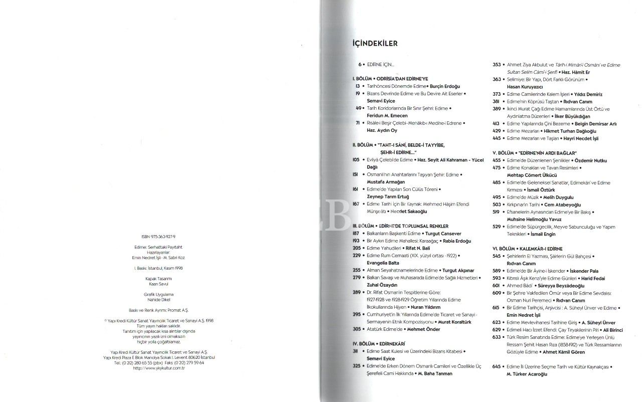 Edirne deyince eski ve yeni dönemleriyle, söylenceden bilime ulaşan tarih; insan eliyle oluşturulmuştur eski ve yeni güzelliklerin arayıcısı, saptayıcısı ve koruyucusu olan sanat tarihi; zanaattan sanata, gelenekselden evrensele ulaşan çizgide pek çok ögeyi buluşturan halk kültürü; yaşam öyküsü ve kimliği bu şehirle özdeşleşen kişiler kitabın ana eksenini oluşturur.