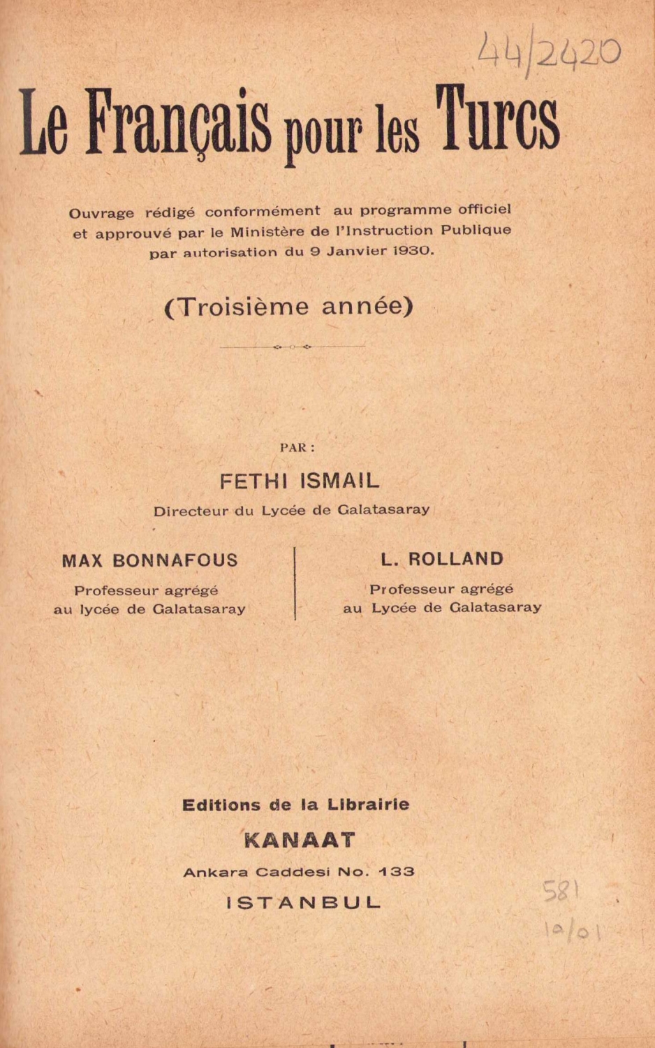 Le Français pour les Turcs - Türkler İçin Fransızca, Fethi İsmail, Max Bonnafous, Louis Rolland, Kanaat Kütüphanesi, İstanbul, resimli, cilt sırtı haliyle, 146 sayfa, 14x20 cm.