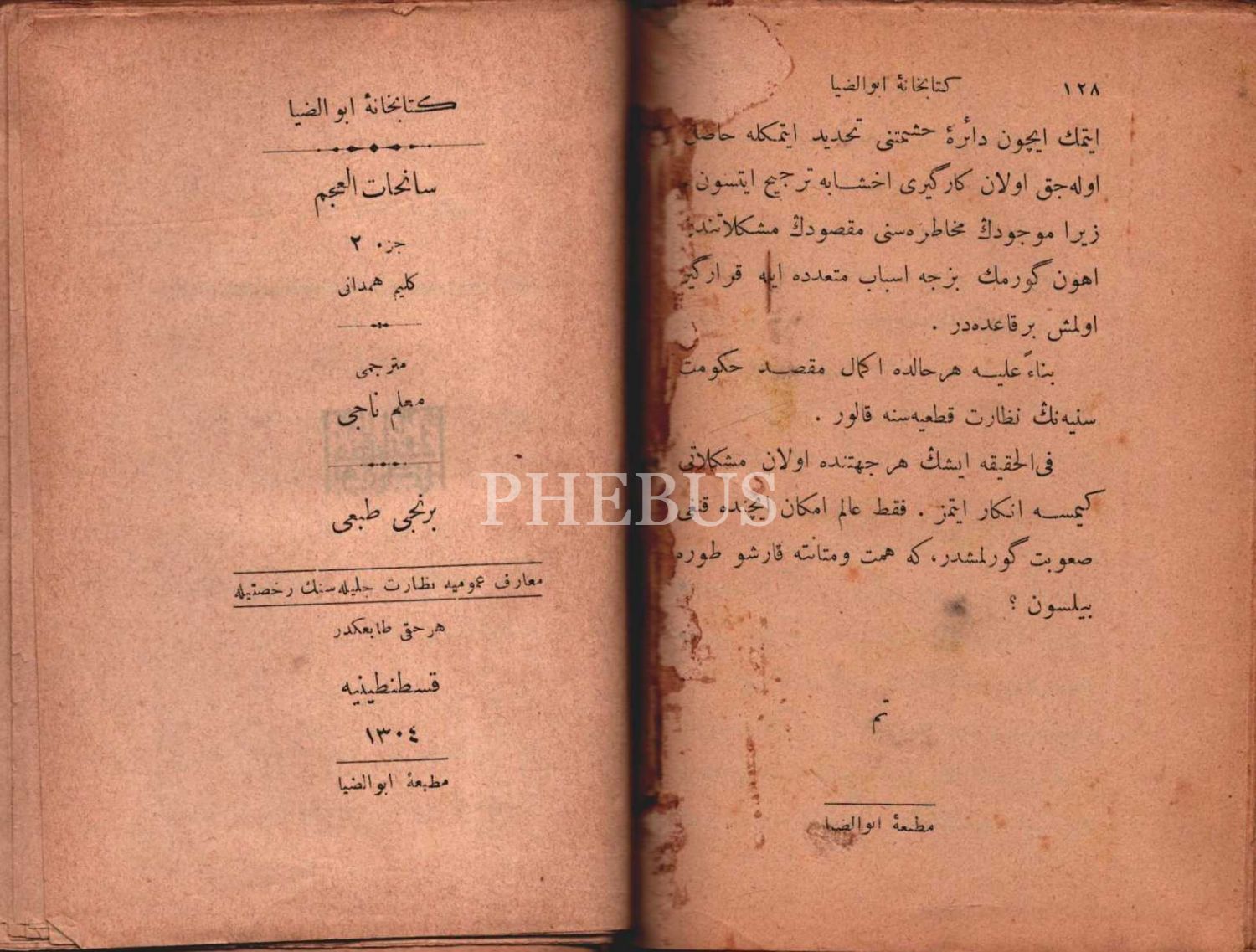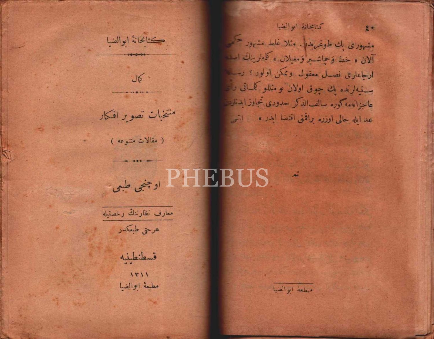 ENGİZİSYON TÂRÎHİ, Ziya Paşa, Matbaa-i Ebuzziya, İstanbul 1305, 107 s.; DEVR-İ İSTÎLÂ, Namık Kemal, Matbaa-i Ebuzziya, İstanbul 1304, 40 s.; MÜNTEHABÂT-I TASVÎR-İ EFKÂR (Makâlât-ı Mütenevvia), Kemal, Matbaa-i Ebuzziya, İstanbul 1311, 128 s.; SÂNİHÂTÜ´L-ACEM (2. Kısım), Kelîm Hemedani, çev. Muallim Naci, Matbaa-i Ebuzziya, İstanbul 1304, 47 s., 11x17 cm