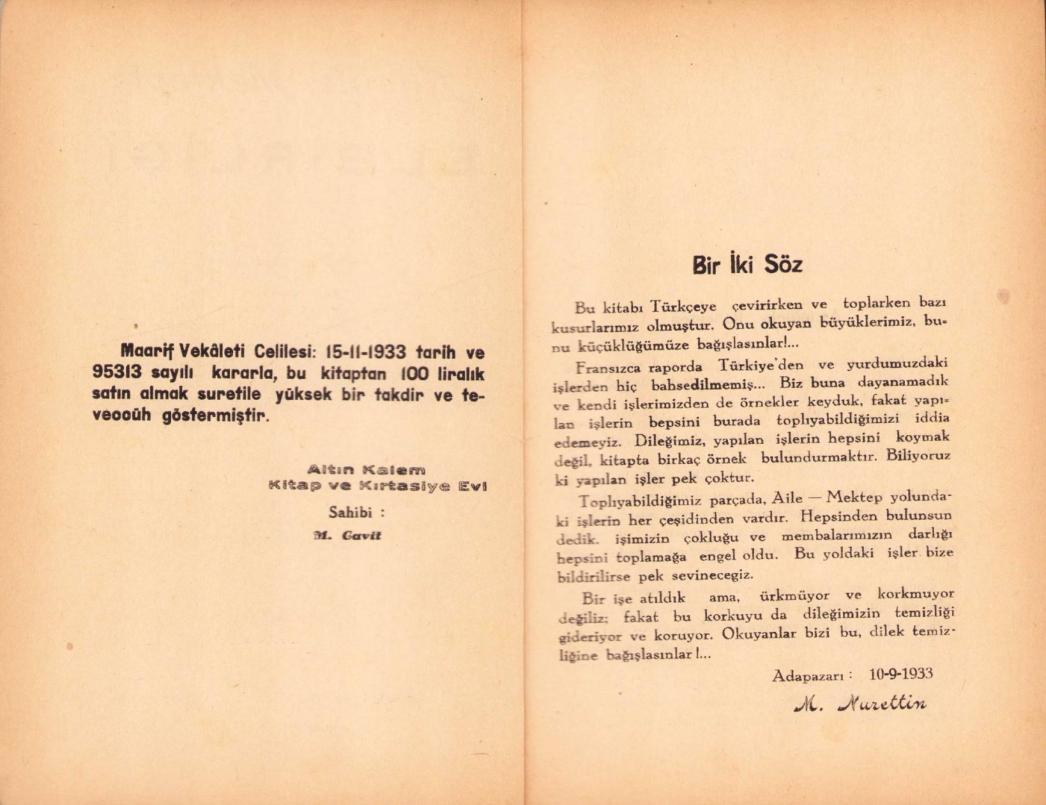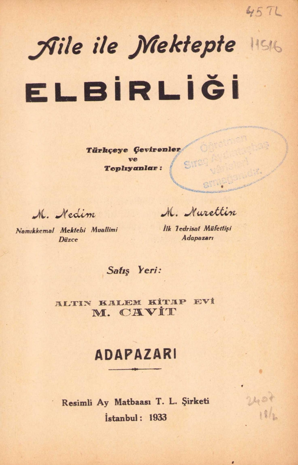 Aile ile Mektepte Elbirliği, çev., M. Nedim - M. Nurettin, İstanbul, 1933, 115 sayfa, 14x20 cm.