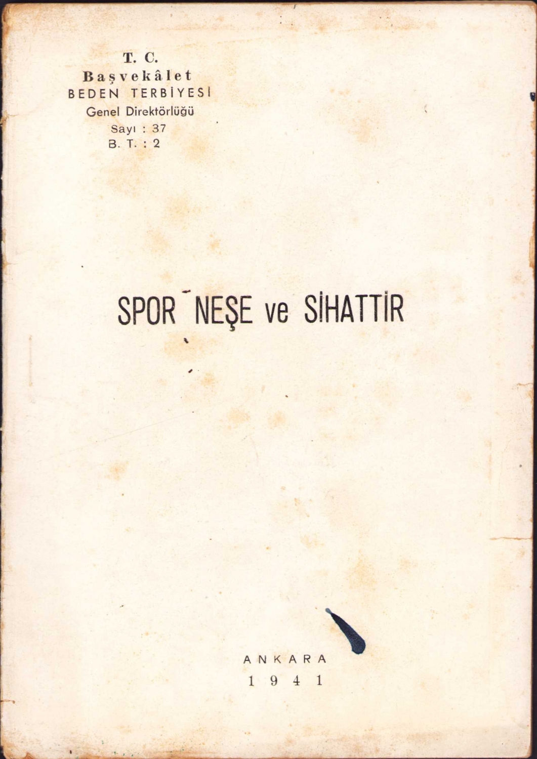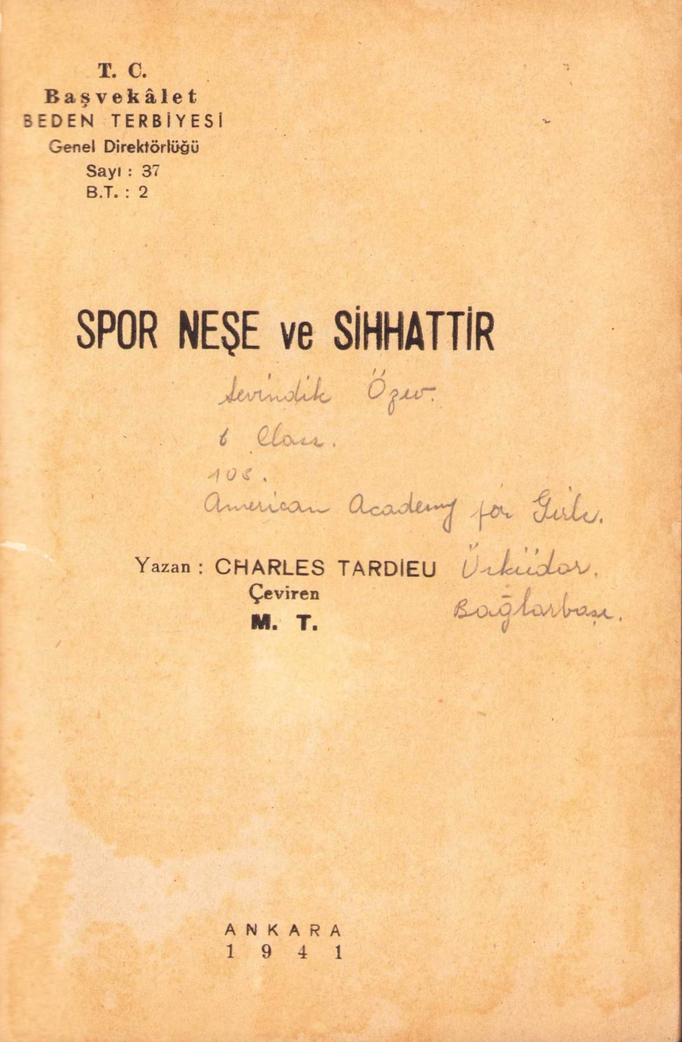 Spor Neşe ve Sihattir, Charles Tardieu, çev., M.T., Ankara, 1941, arka kapak bir kenarı kopuk, 72 sayfa, 13x19 cm.