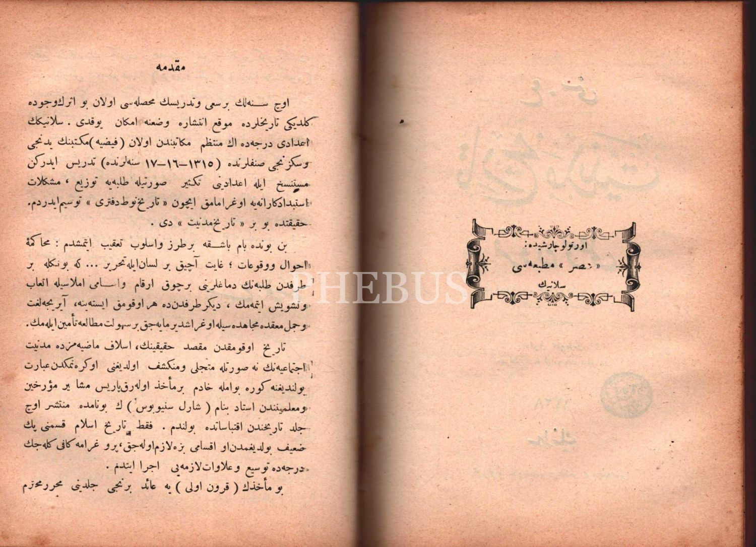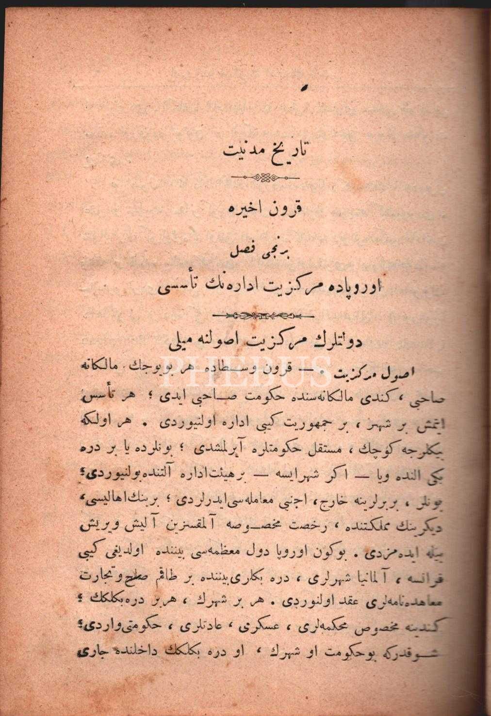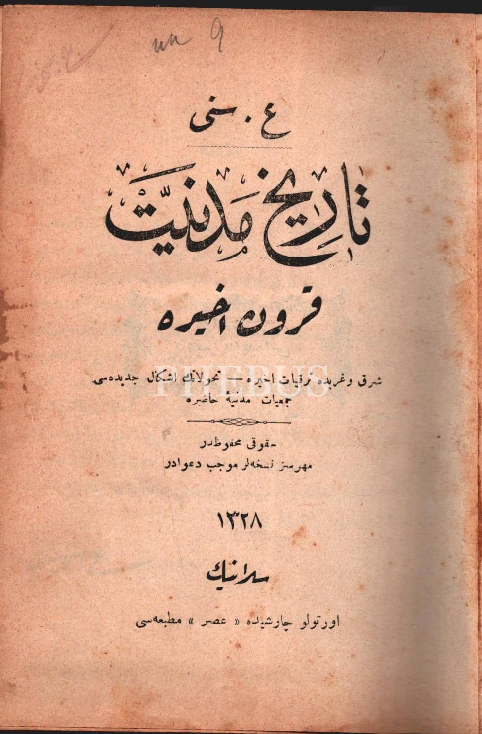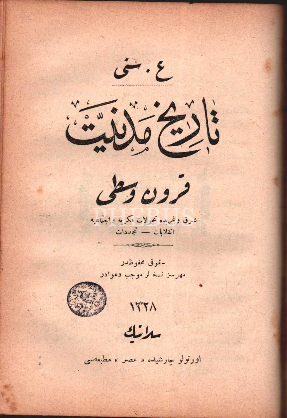TÂRÎH-İ MEDENİYYET (Kurûn-ı Ahîre ve Kurûn-ı Vüstâ), A. Sina, Asr Matbaası, Selanik 1328, 312+247 s., 14x19 cm