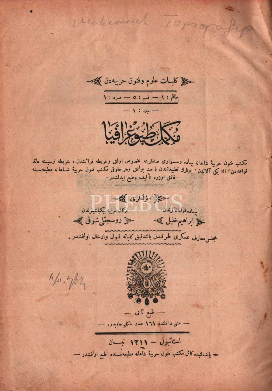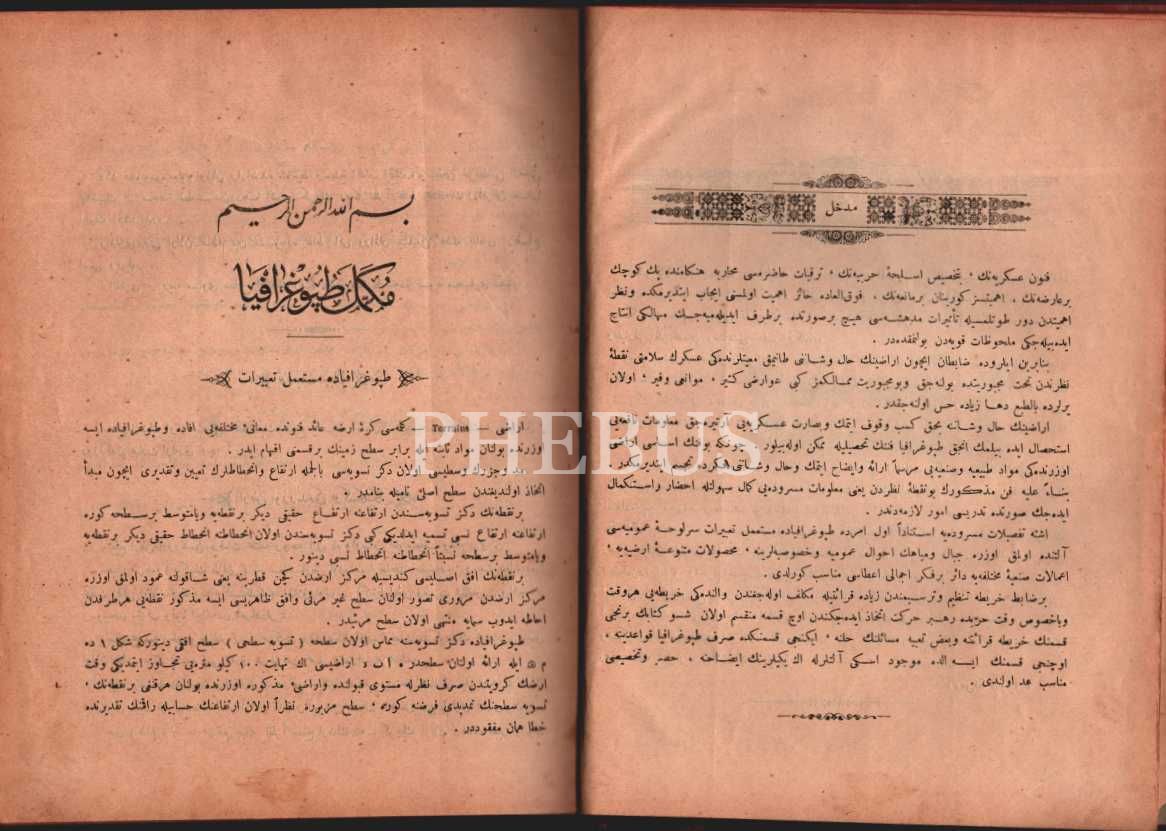 Osmanlı armalı ve ay yıldızlı cildinde MÜKEMMEL TOPOGRAFYA (1. Cilt), İbrahim Halil & Ruscuklu Şevki, Mekteb-i Fünun-ı Harbiye-i Şahane Matbaası, İstanbul 1311, 150 s., 20x26 cm