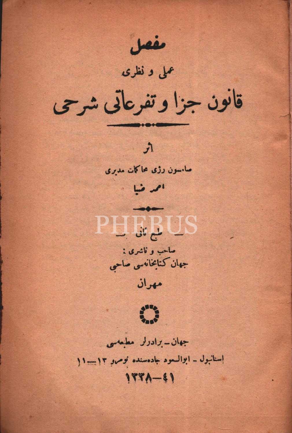 MUFASSAL AMELÎ VE NAZARÎ KÂNÛN-I CEZÂ VE TEFERRUÂTI ŞERHİ, Ahmed Ziya, Cihan Biraderler Matbaası, İstanbul 1338, 920 s., 15x20 cm