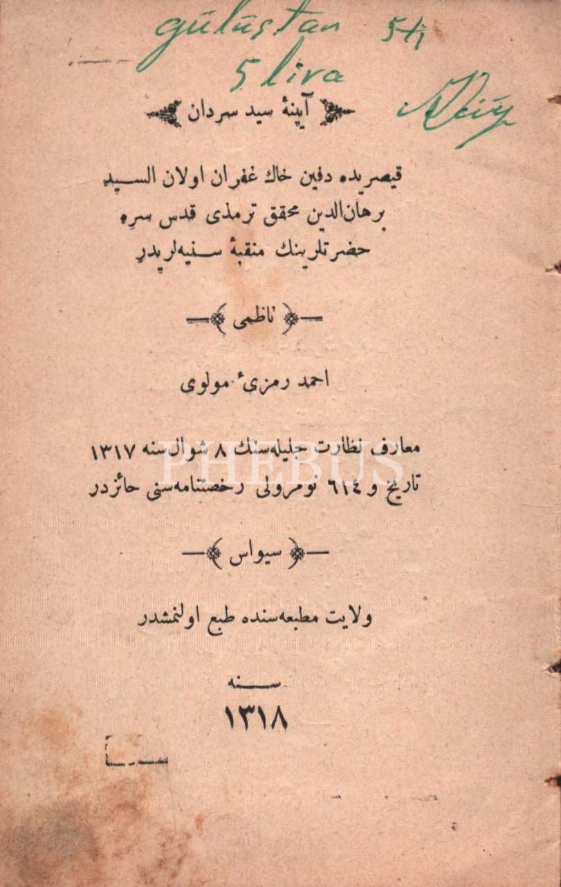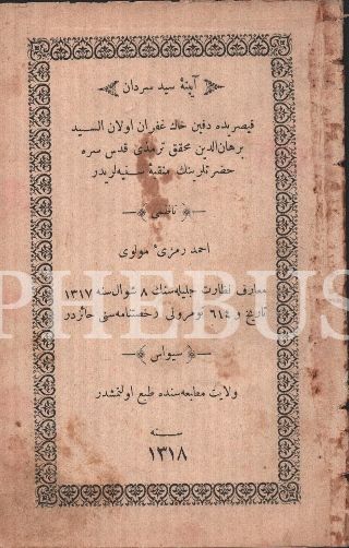 ÂYİNE-İ SEYYİD SERDÂN [Manzum], Ahmed Remzi Mevlevi, Vilayet Matbaası, Sivas 1318, 9 s., 10x16 cm