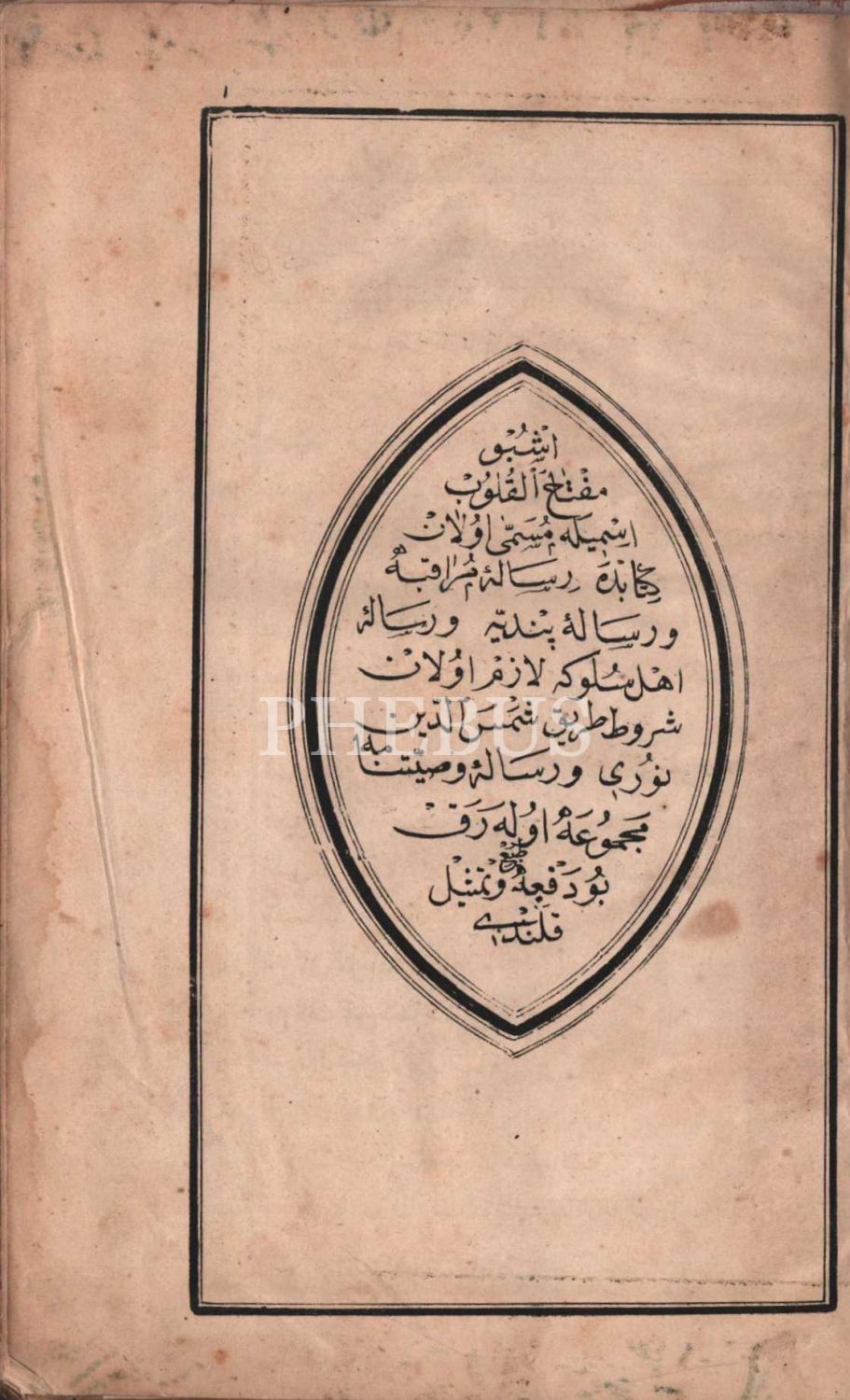 "İşbu MİFTÂHU´L-KULÛB ismiyle müsemma olan kitaba RİSÂLE-İ MURÂKABE ve RİSÂLE-İ PENDİYYE ve RİSÂLE-İ EHL-İ SÜLÛKA LÂZIM OLAN ŞURÛT-I TARÎK-İ ŞEMSEDDÎN NÛRÎ ve RİSÂLE-İ VASİYYETNÂME mecmua olarak bu defa tab´ ve temsil kılındı"