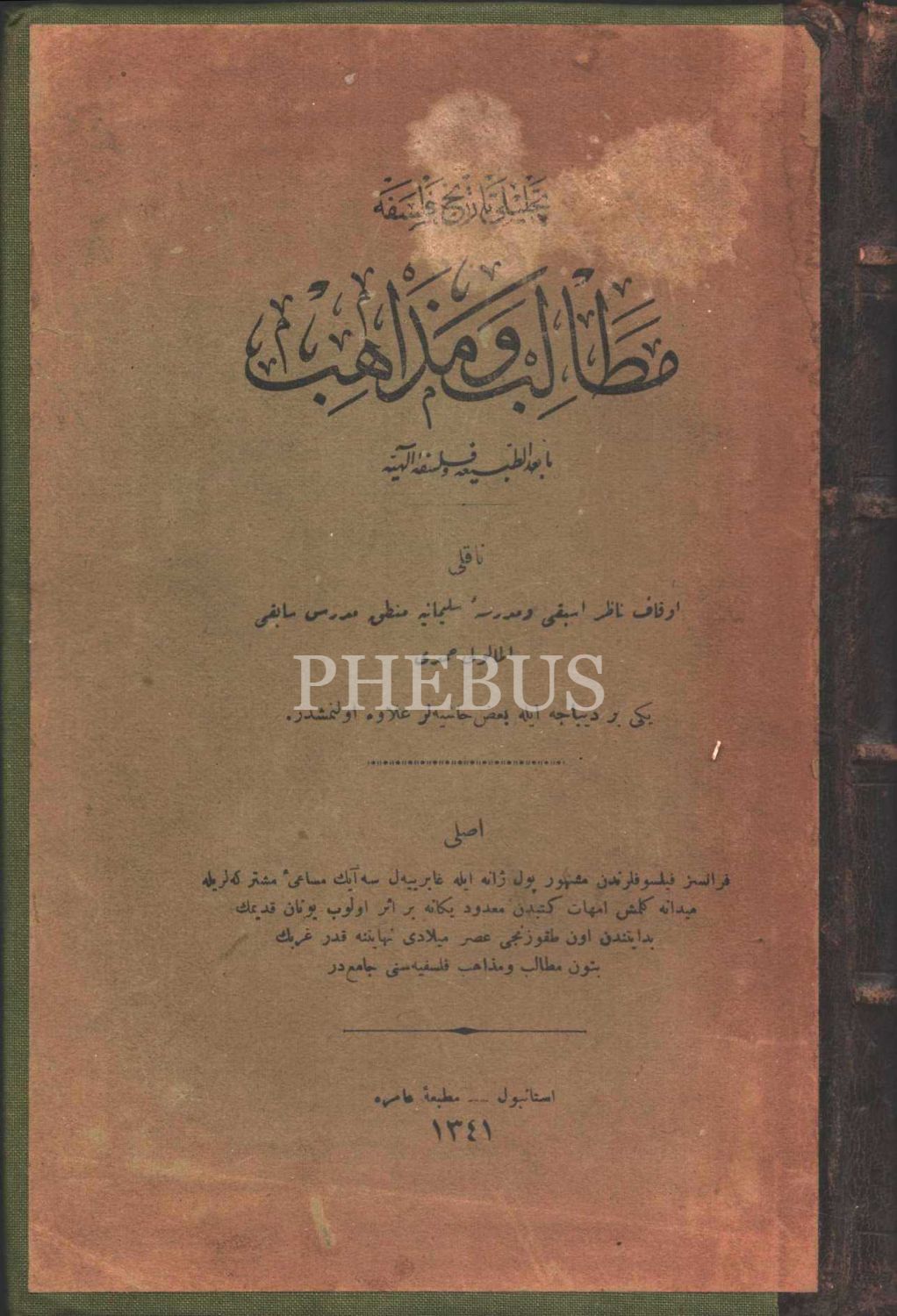 Deri sırtlı cildinde TAHLÎLÎ TÂRÎH-İ FELSEFE: METÂLİB VE MEZÂHİB (Mâba´de´t-tabîa ve Felsefe-i İlâhiyye), Paul Janet & Gabriel Seailles, çev. Elmalılı Hamdi, Matbaa-i Amire, İstanbul 1341, 333 s., 16x24 cm