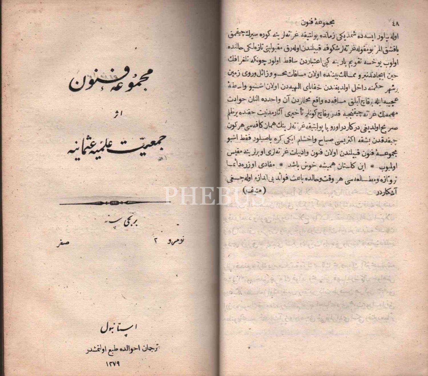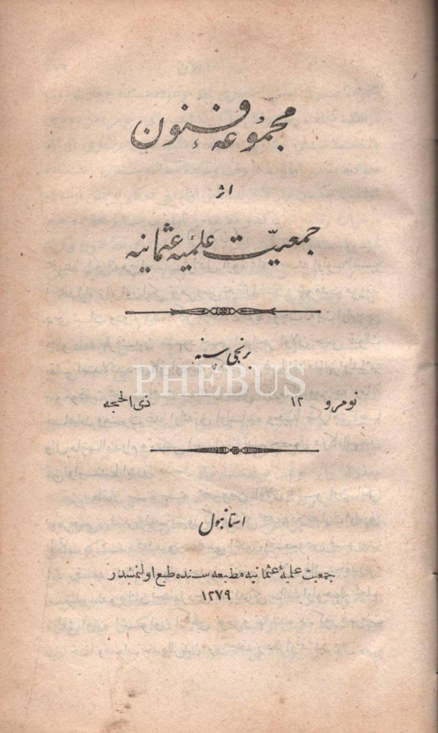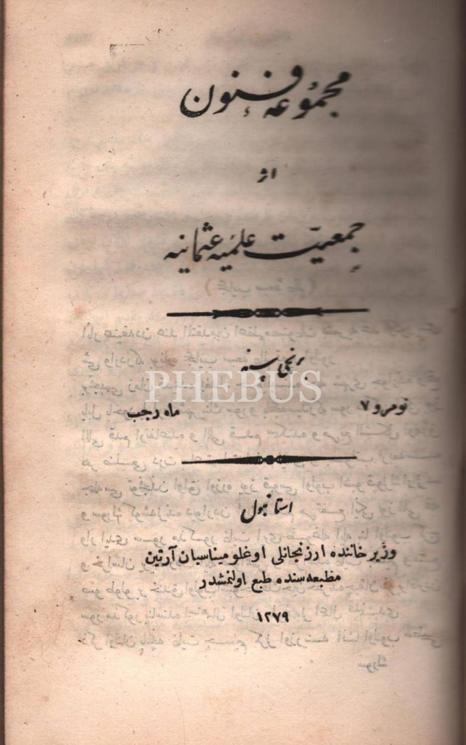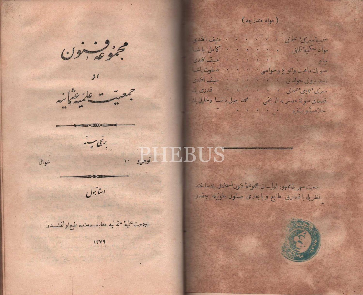Deri cildinde, Cem´iyyet-i İlmiyye-i Osmâniyye´nin hazırladığı MECMÛA-İ FÜNÛN´un 10 sayısı, Tercüman-ı Ahval Matbaası & Erzincanlıoğlu Minasyan Artin Matbaası & Cemiyet-i İlmiye-i Osmaniye Matbaası, İstanbul 1279, 512 s., 13x21 cm