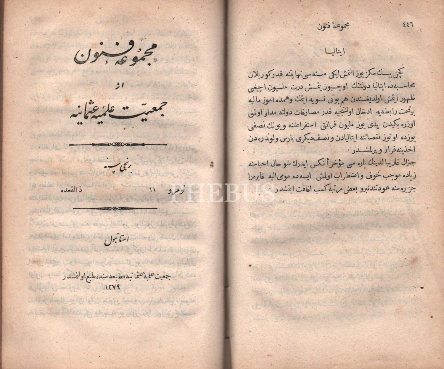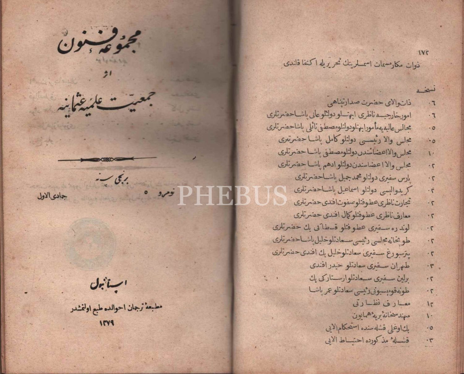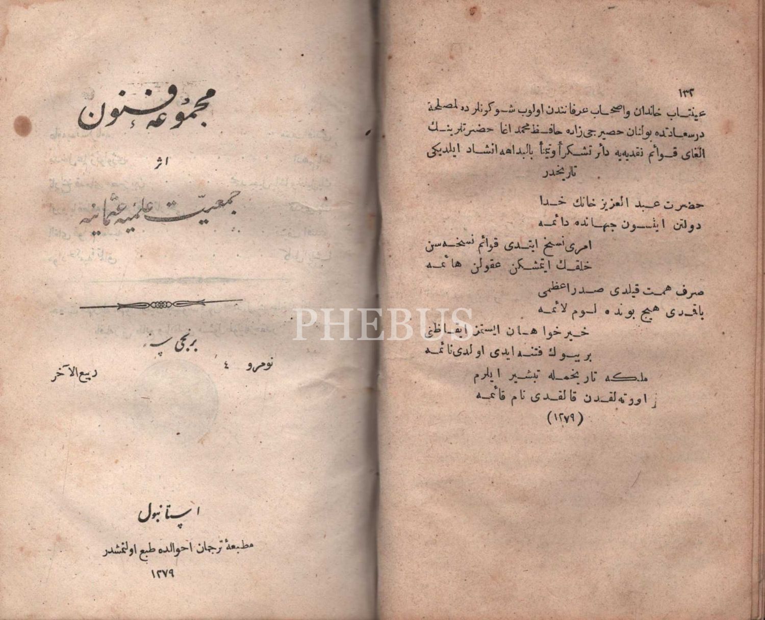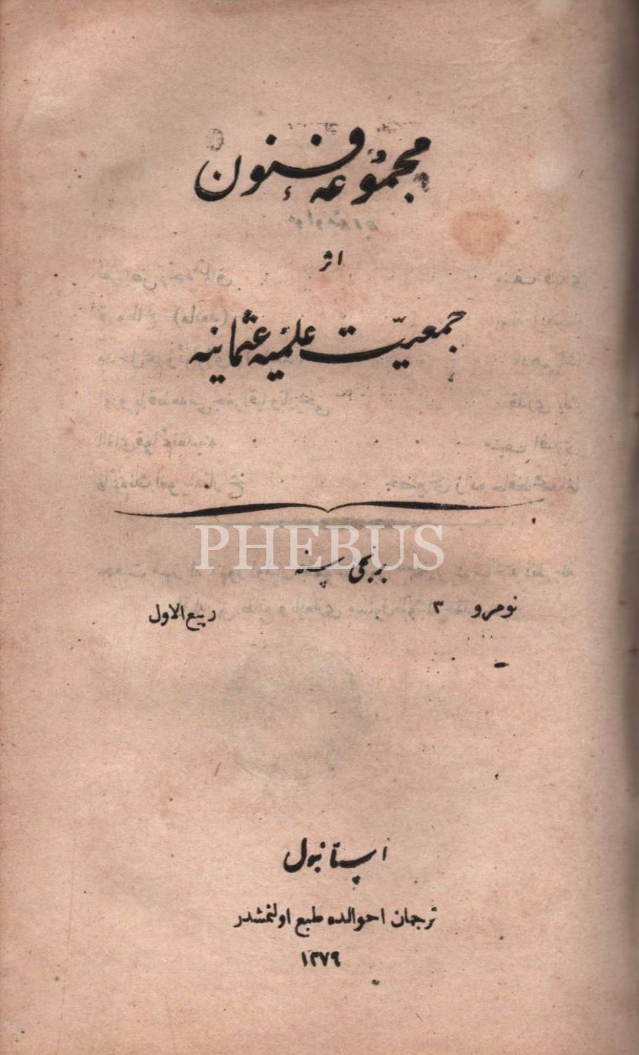 Deri cildinde, Cem´iyyet-i İlmiyye-i Osmâniyye´nin hazırladığı MECMÛA-İ FÜNÛN´un 10 sayısı, Tercüman-ı Ahval Matbaası & Erzincanlıoğlu Minasyan Artin Matbaası & Cemiyet-i İlmiye-i Osmaniye Matbaası, İstanbul 1279, 512 s., 13x21 cm