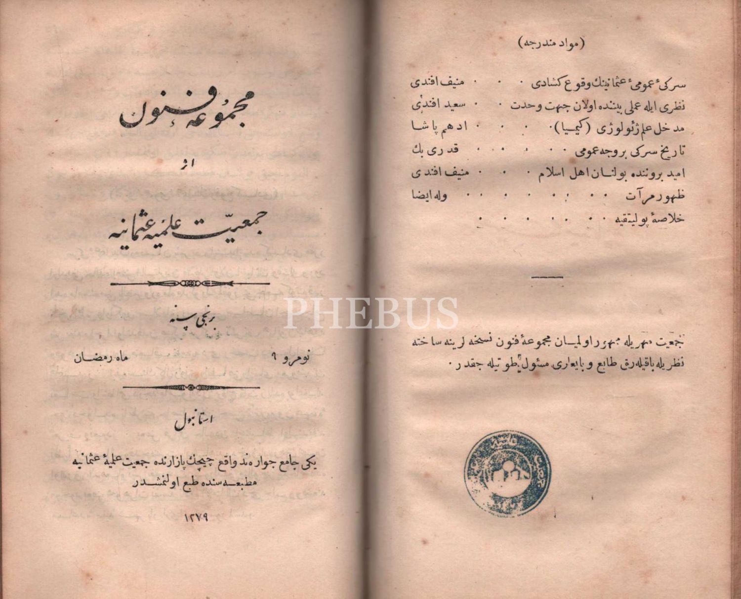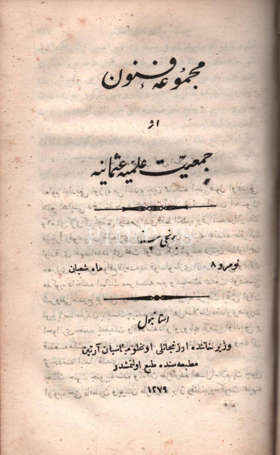 Cemiyet-i İlmiye-i Osmaniye Nizamnamesi ile başlayan kitapta Mecmuanın 1. ve 6. sayıları mevcut değildir.