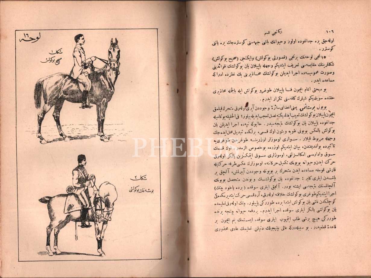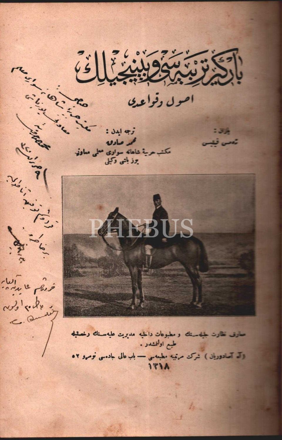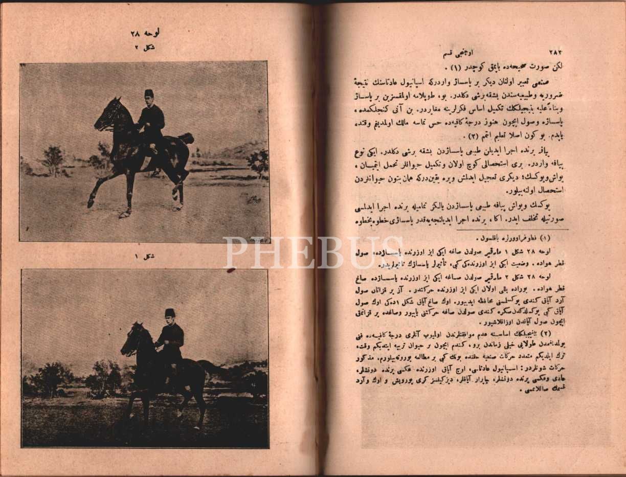 BEYGİR TERBİYESİ VE BİNİCİLİK USÛL VE KAVÂİDİ, tercüme eden: Mekteb-i Harbiyeyi Şahane Süvari Muallimi Mehmed Sadık, Artin Asaduryan Şirket-i Matbaası, 1318, 336 sayfa, 17x24 cm