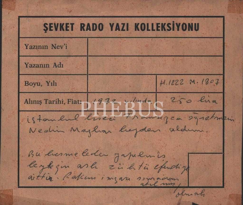 "İstanbul Lisesi Fransızca öğretmeni Nedim Mazhar beyden aldım. Bu besmeleden yapılmış leyleğin aslı Zühtü Efendi´ye aittir. Rakım imzası sonradan atılmış olmalı."