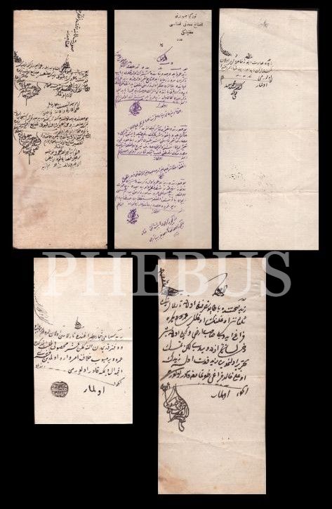 Öşür, ticaret, şahitlik, emanet ve ortalık konularında kaleme alınmış 5 adet fetva, muhtelif boyutlarda
