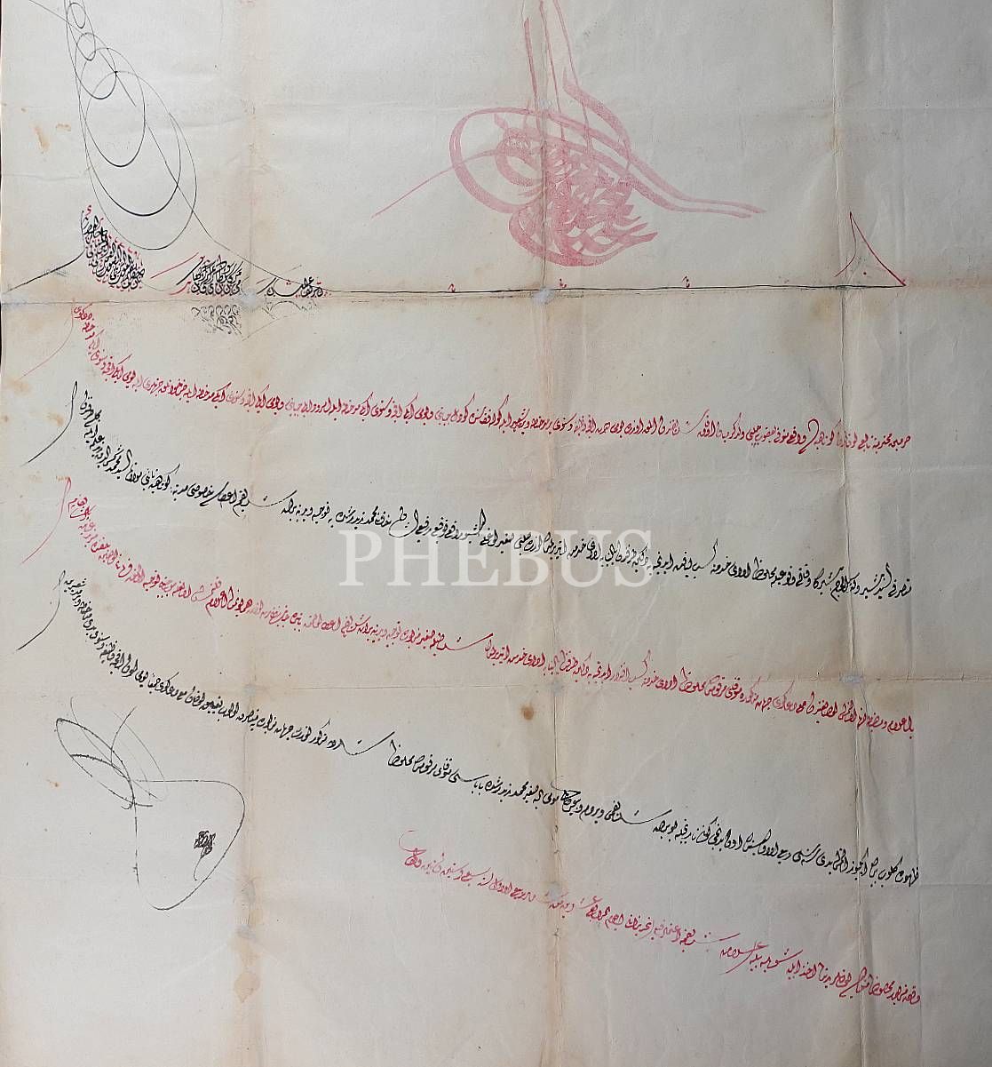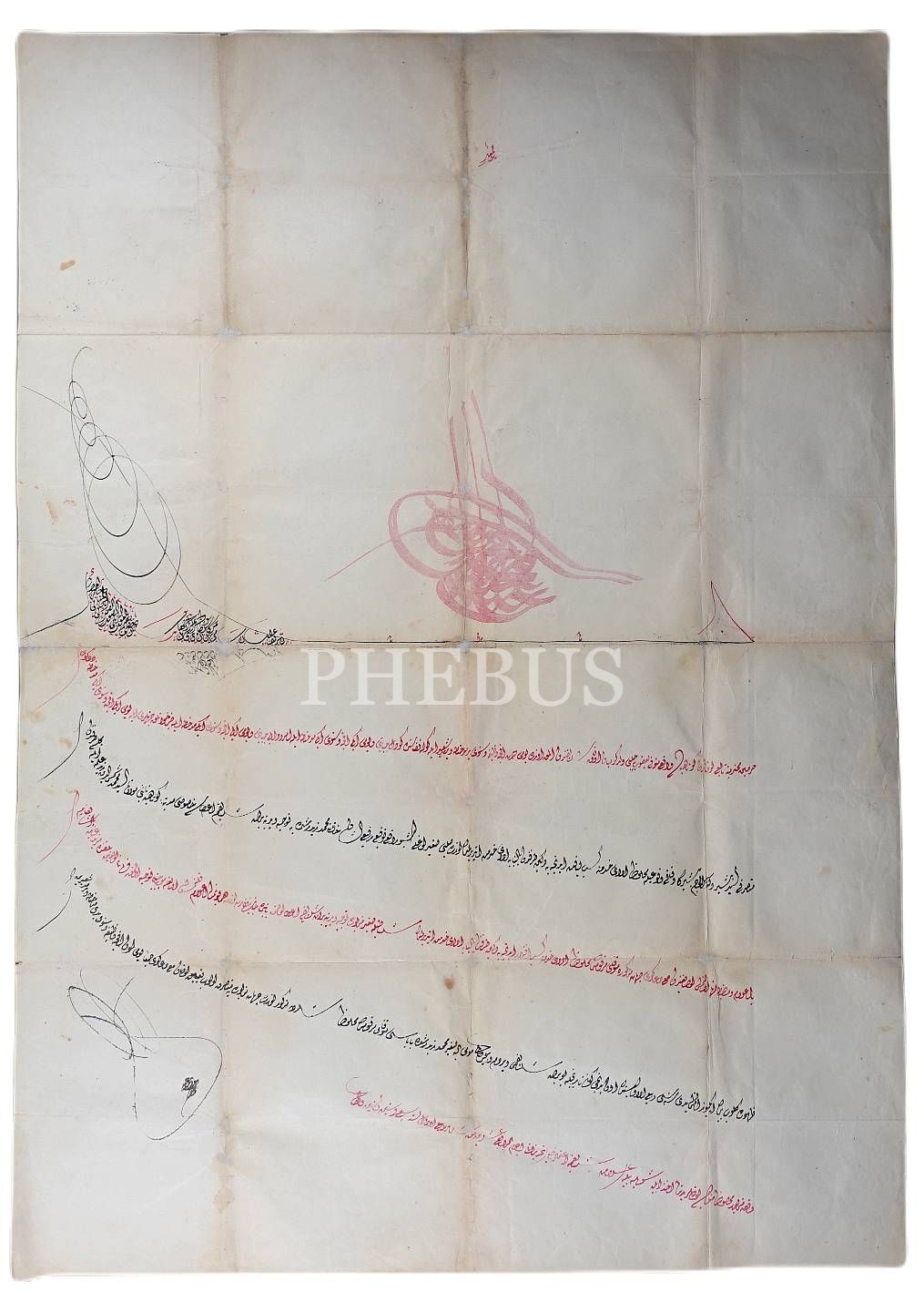 Hareym-i Muhteremeyn Evkafından Kütahya´da cüzhavanlık vazifesinin vekaleten devriyle alakalı 24 Rabiyülevvel 1267 tarihli, el çekme Abdülmecid tuğralı berat, 55x78 cm