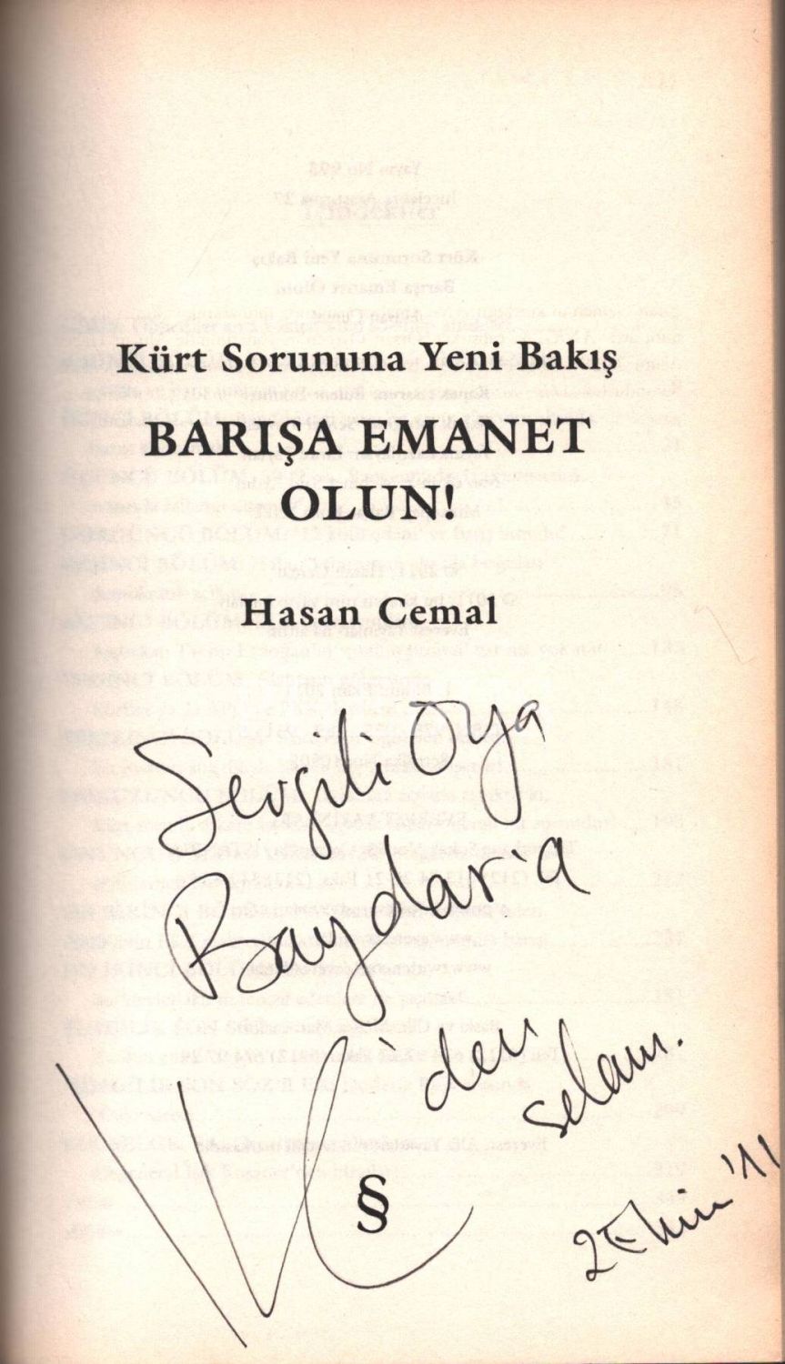 Hasan Cemal´den Oya Baydar´a ithaflı ve imzalı Kürt Sorununa Yeni Bakış: BARIŞA EMANET OLUN!, Everest Yayınları, Ekim 2011, 342 sayfa metin + görseller, 14x23 cm