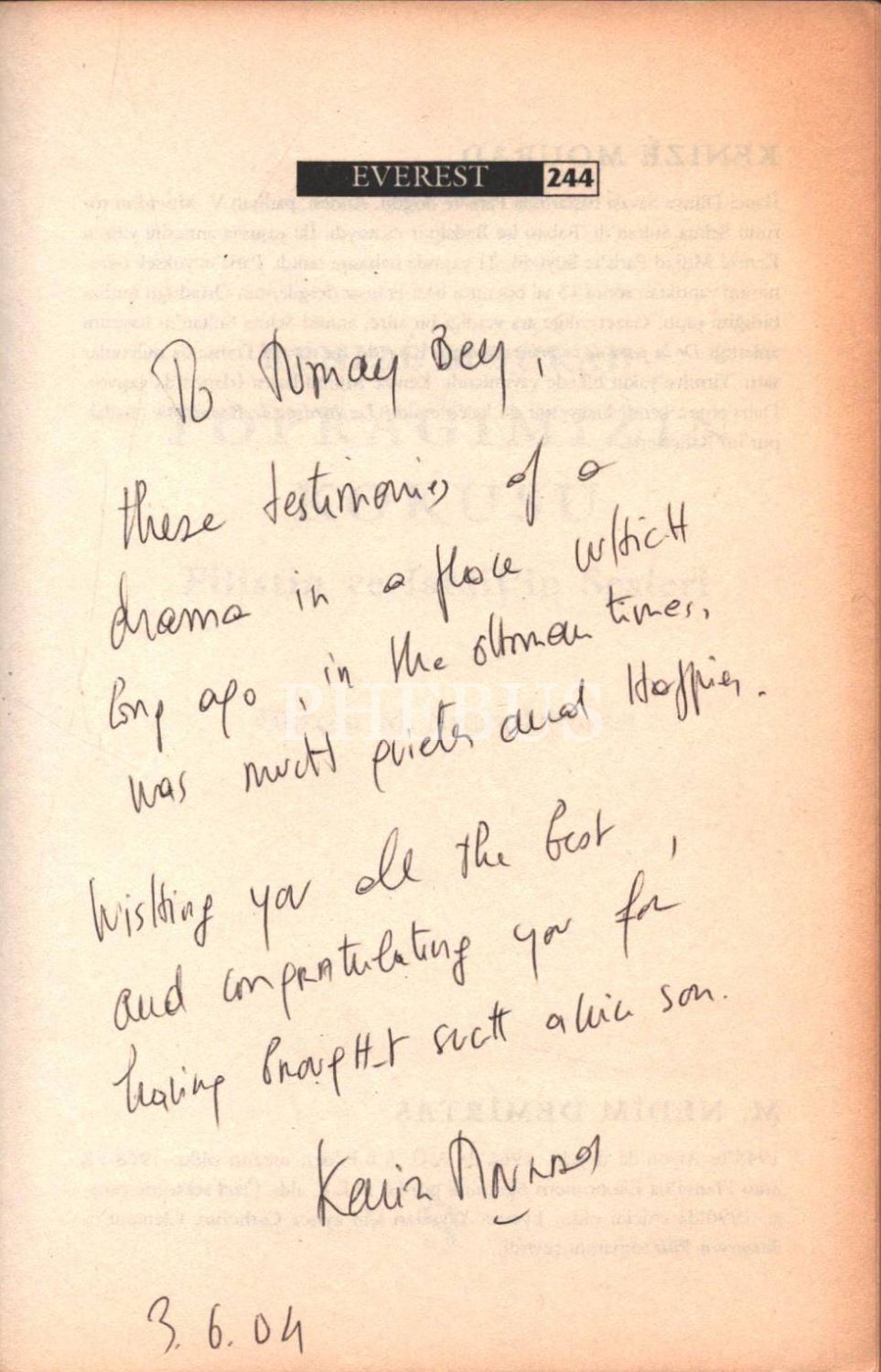 Kenize Mourad´ın "Tumay Bey" için kaleme aldığı 3 Haziran 2004 tarihli İngilizce ithaf okunamamıştır.