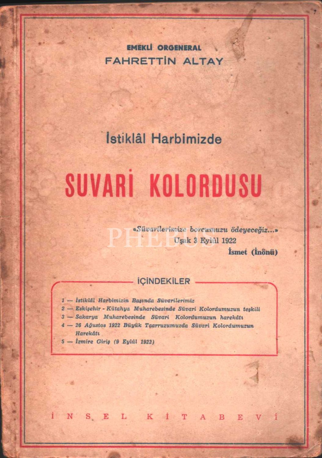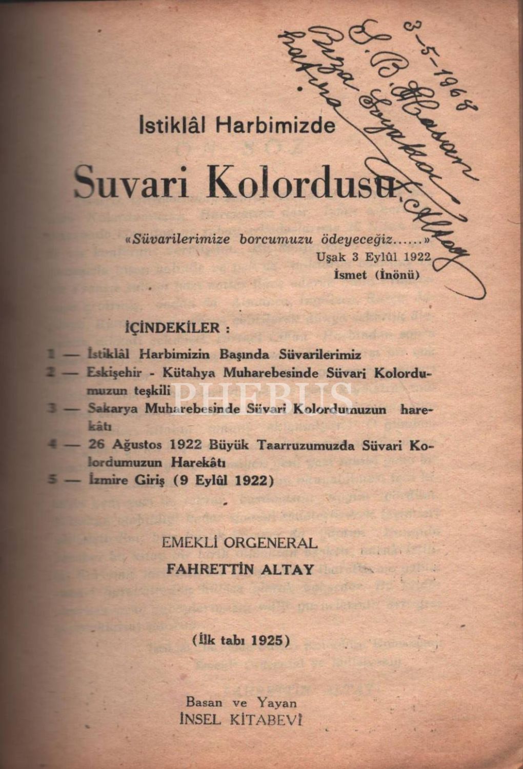 Fahrettin Altay´dan Hasan Rıza Soyak´a ithaflı ve imzalı İSTİKLÂL HARBİMİZDE SUVARİ KOLORDUSU, İnsel Kitabevi, 1949, 77 sayfa, 14x20 cm