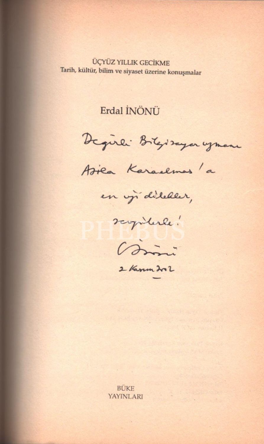 Erdal İnönü´den ithaflı ve imzalı ÜÇYÜZ YILLIK GECİKME (Tarih, Kültür, Bilim ve Siyaset Üzerine Konuşmalar), Büke Yayınları, Eylül 2002, 255 sayfa, 13x20 cm
